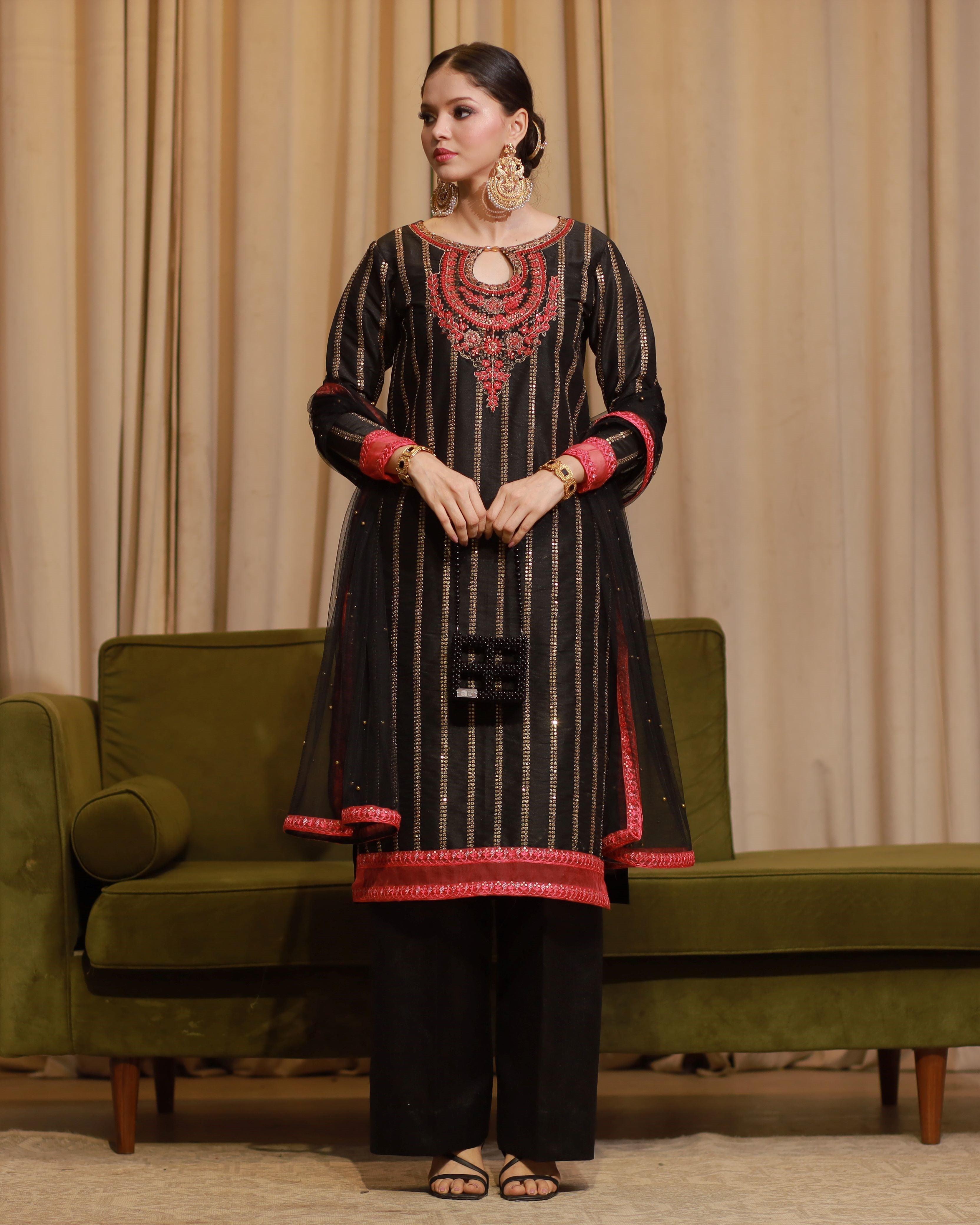A meticulously crafted exotic all black ready to wear ensemble, perfect for the wedding guests. Sequin embroidered Raw silk long shirt with embroidered neckline with tilla and sequin. Embroidered organza patches on sleeves and shirt hem. Pearl embellished net dupatta with embroidered patches all around it. Look is completed with a raw silk culotte to perfectly complement the desi festive vibe.