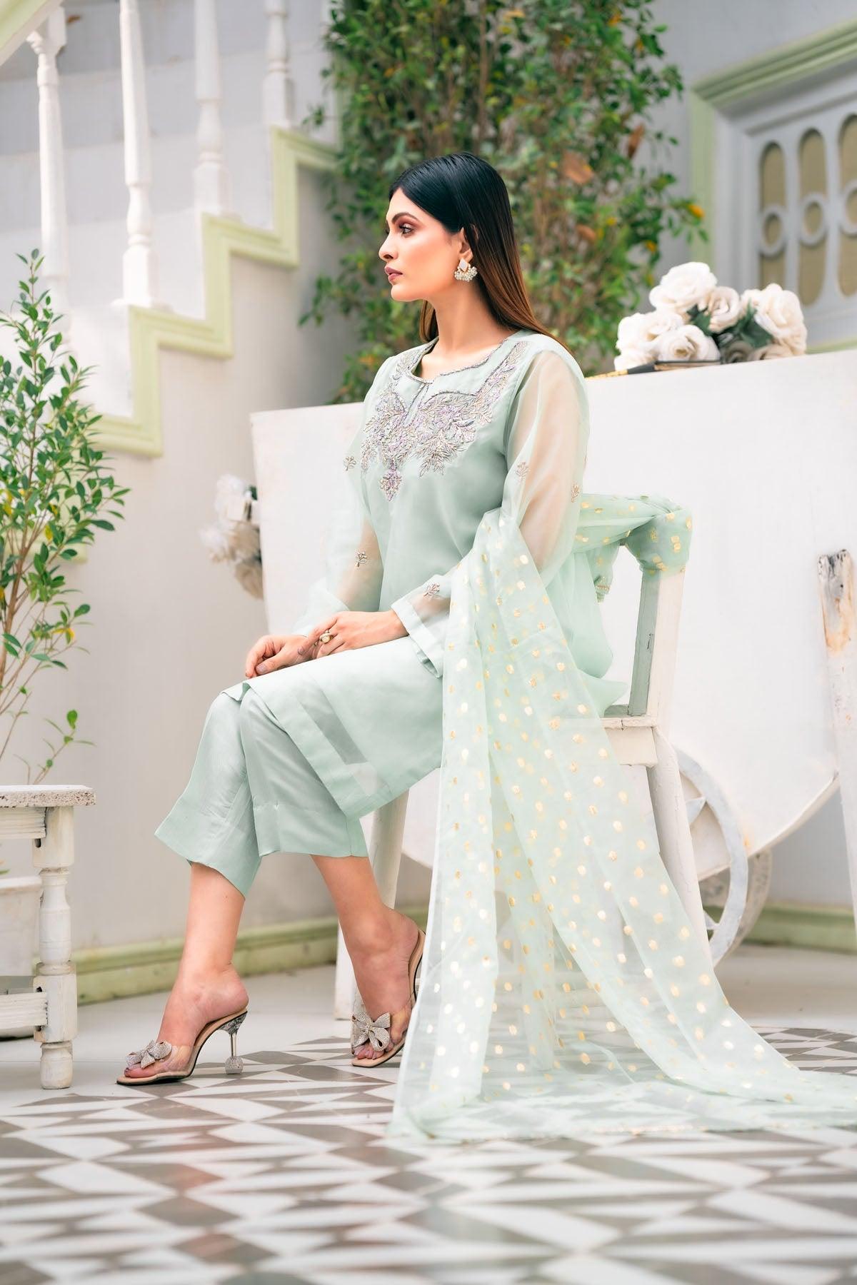 Indulge in the allure of "Levander Dream," a three-piece marvel marrying classic sophistication with modern elegance. With delicate piping throughout, this ensemble adorns itself in mashed Gotti 3D embellishments and double-shaded Tilla work. The organza dupatta, embellished with fancy Broshia and lace, adds an ethereal touch to this dreamy attire, crafted from exquisite fabrics like organza, cotton silk, and viscose silk. Standing at 38 inches, our model brings this enchanting vision to life, inviting you into a world where glamour meets fantasy.