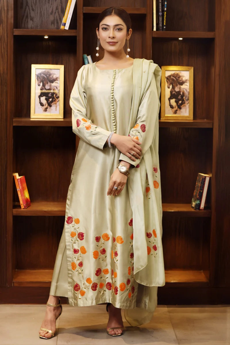 This 3-Piece Baad e Saba set features a stylish Pistachio Hand Painted and Naqshi work Pure silk Full length Shirt with Full Sleeves for an effortlessly elegant look. The 2.75 yards long Pistachio silk dupatta is adorned with delicate gold Sequin and tilla borders, adding a touch of luxury to the overall design. Made from Pure Silk and Amur Silk, this set is truly exquisite.