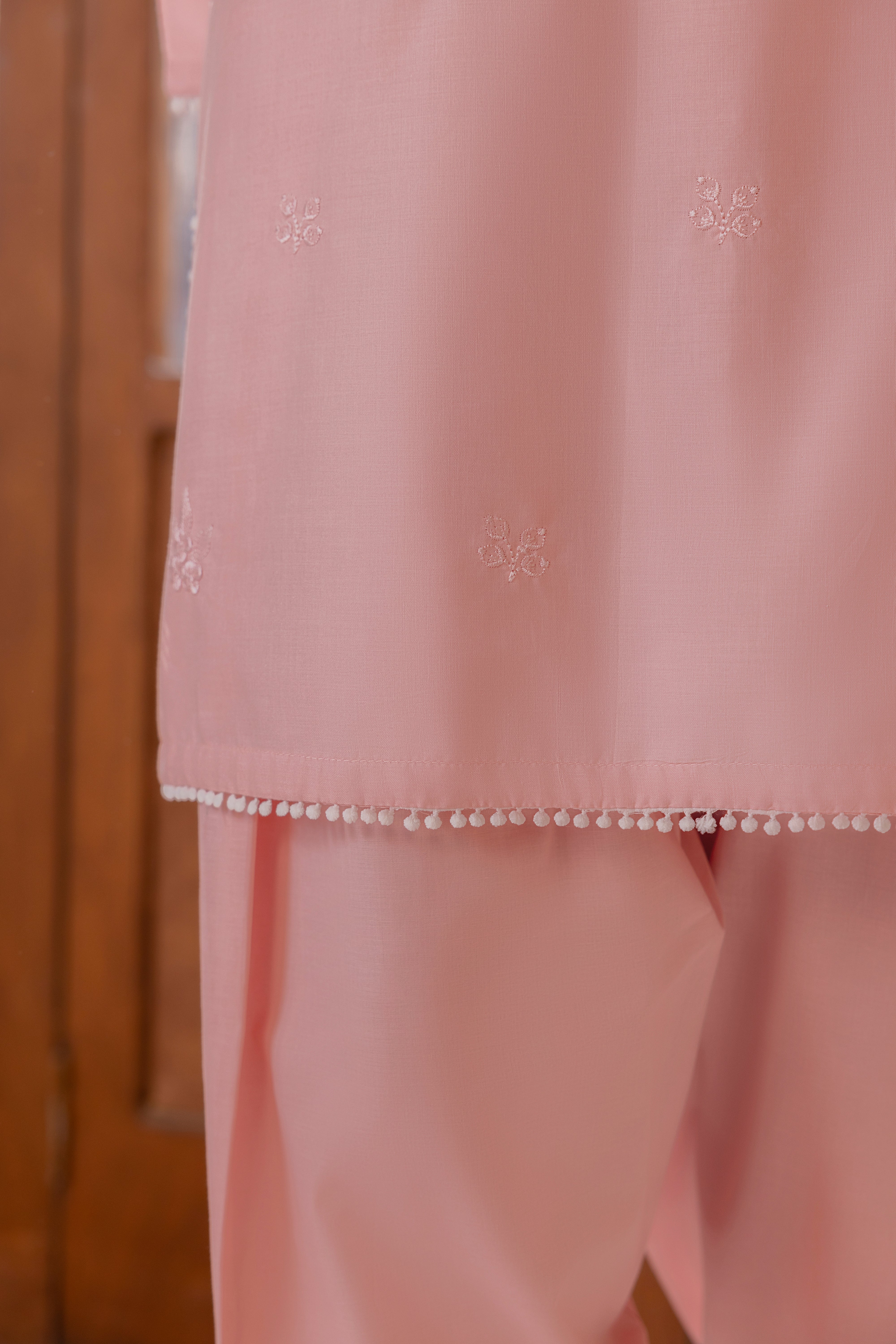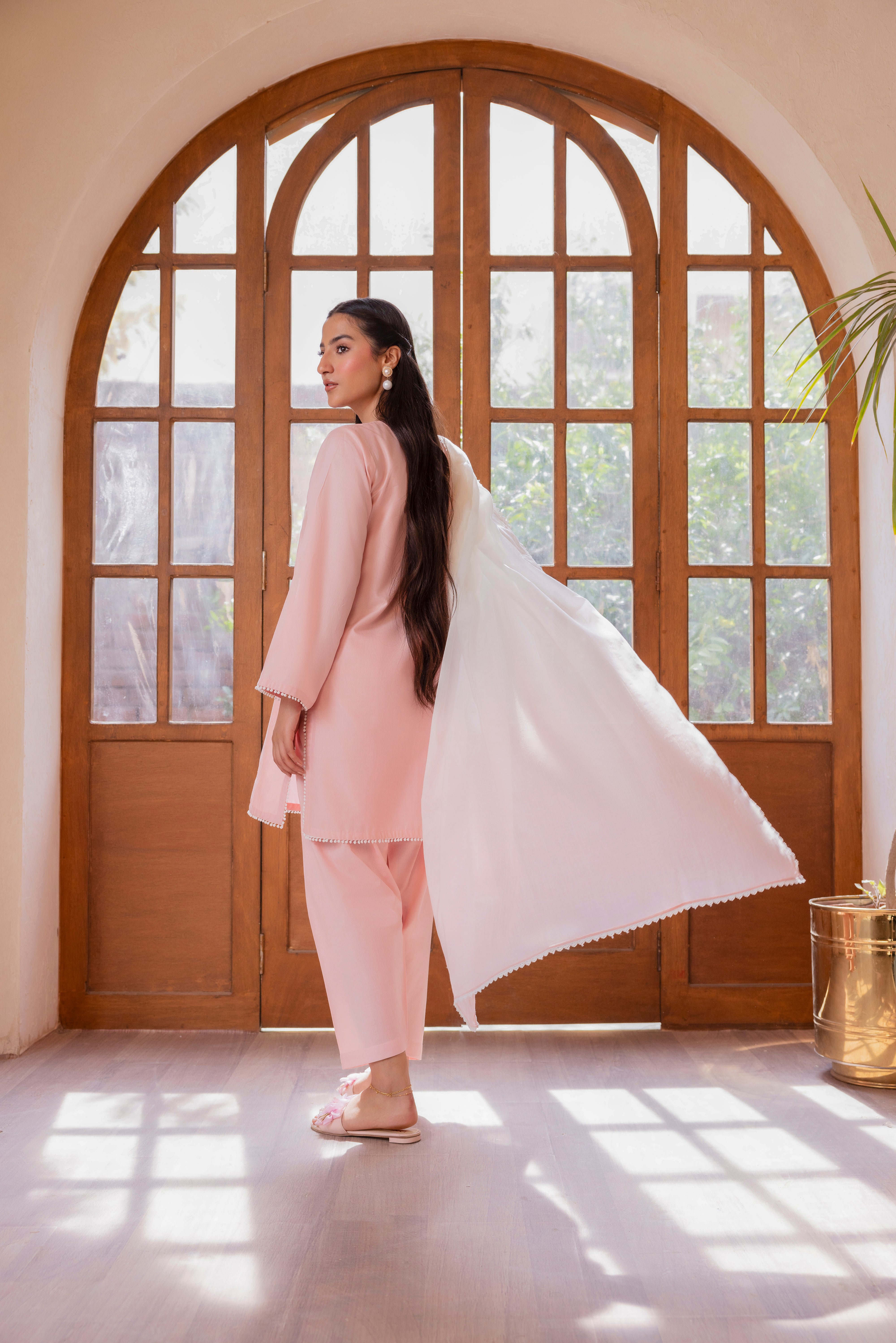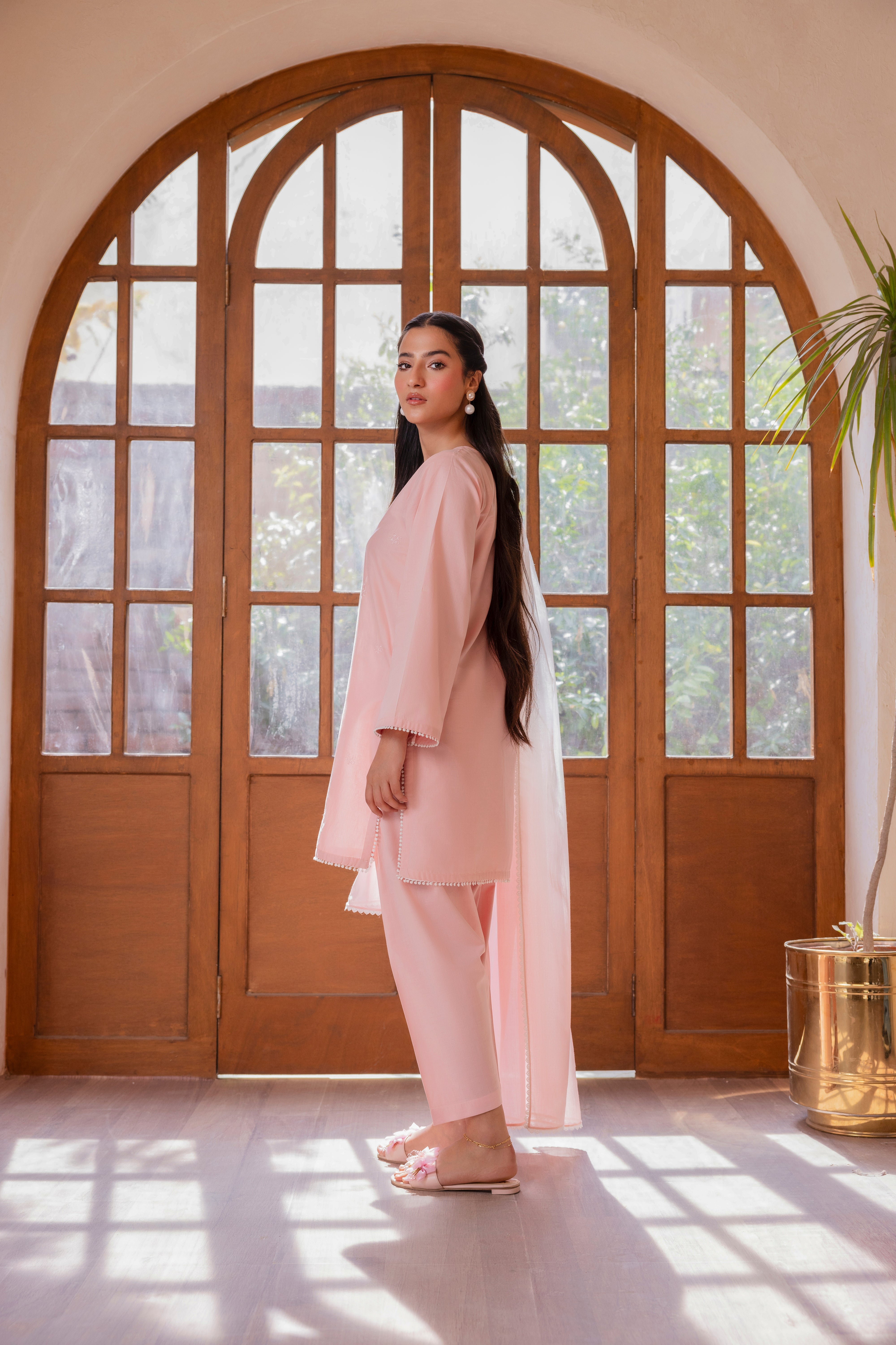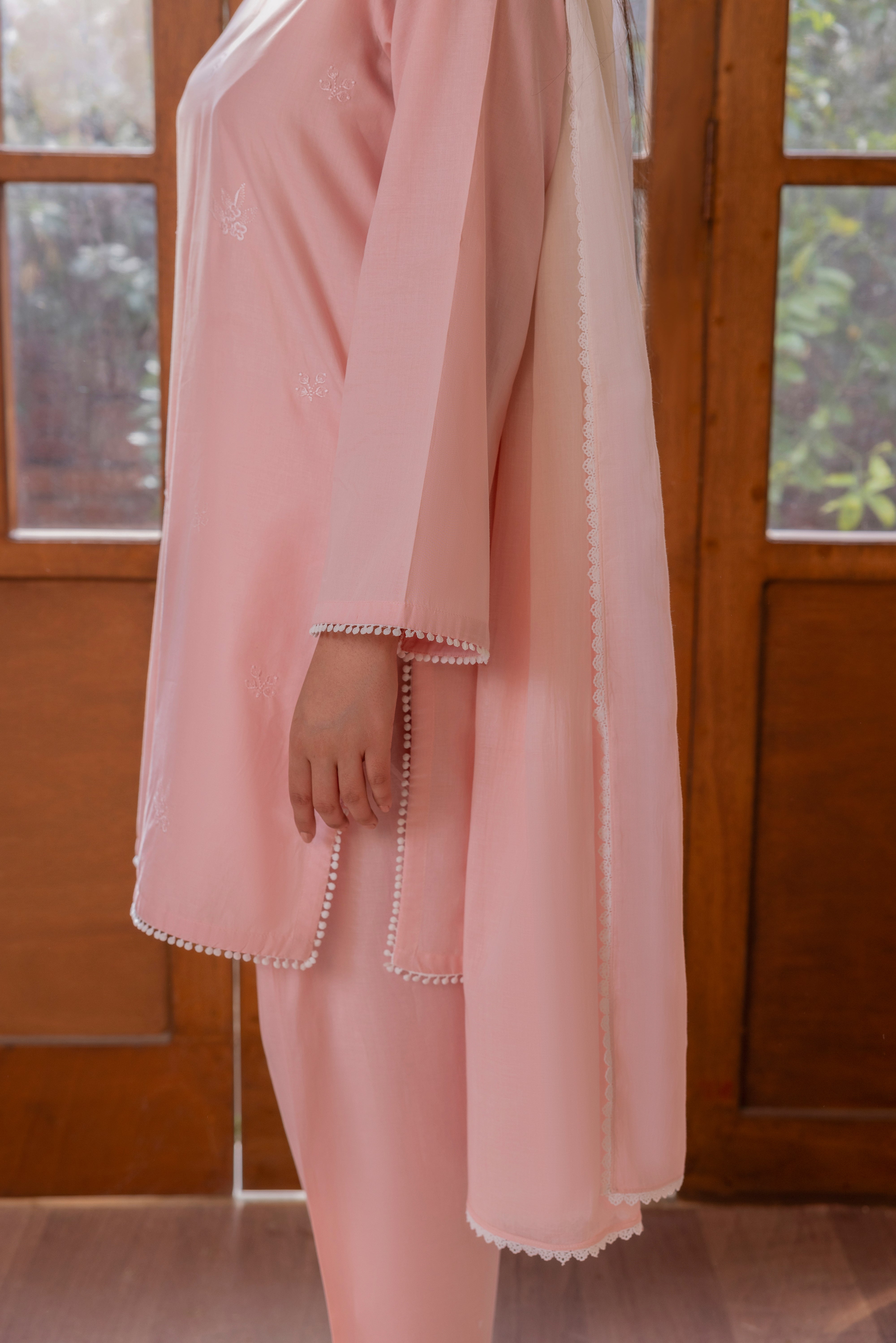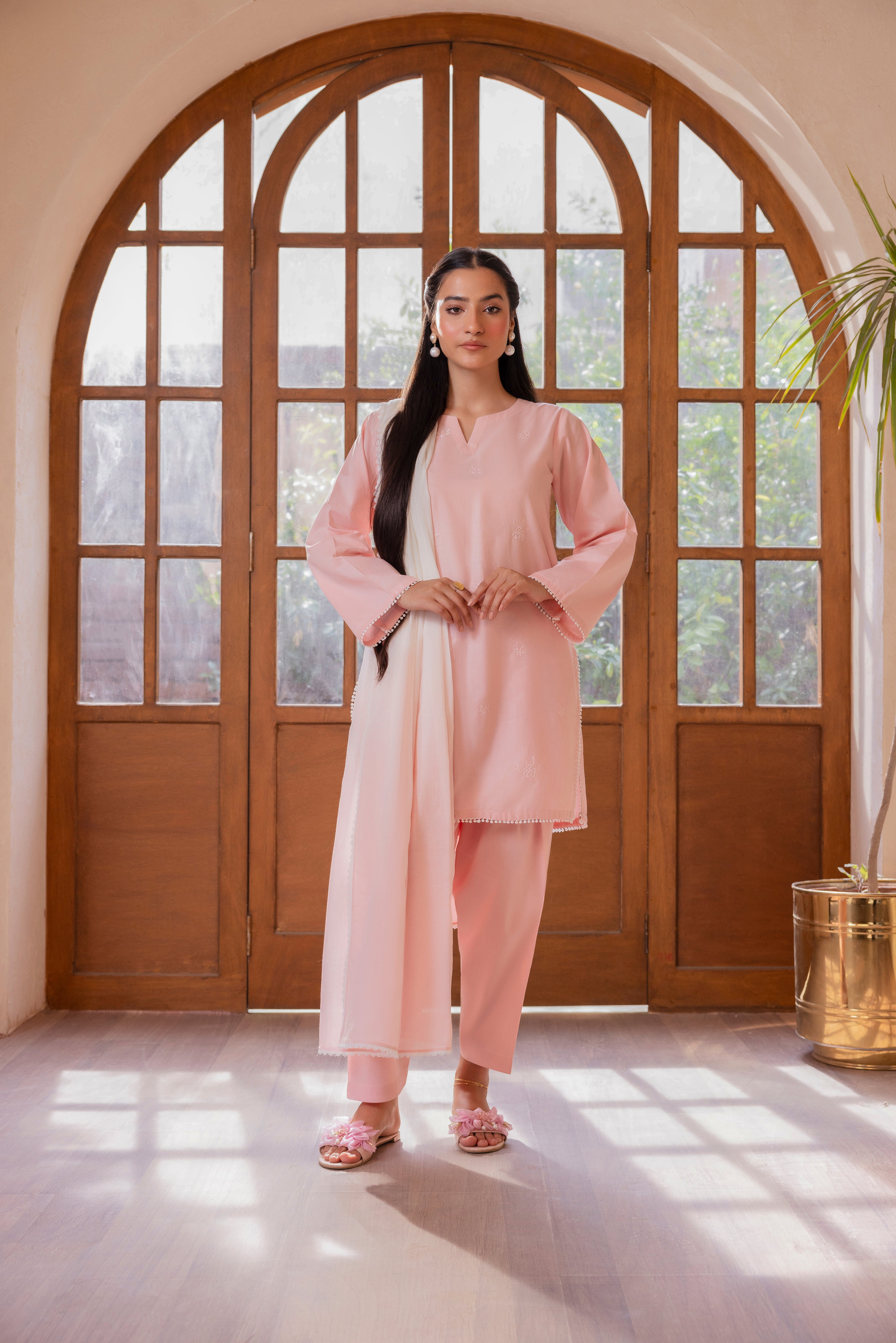 Radiate charm in our pink 3-piece suit, featuring delicate floral embroidery adorning the shirt, elegantly paired with a complementary shalwar and a two tone dyed dupatta with lace on all four sides. Perfect for adding a touch of feminine grace to your ensemble.