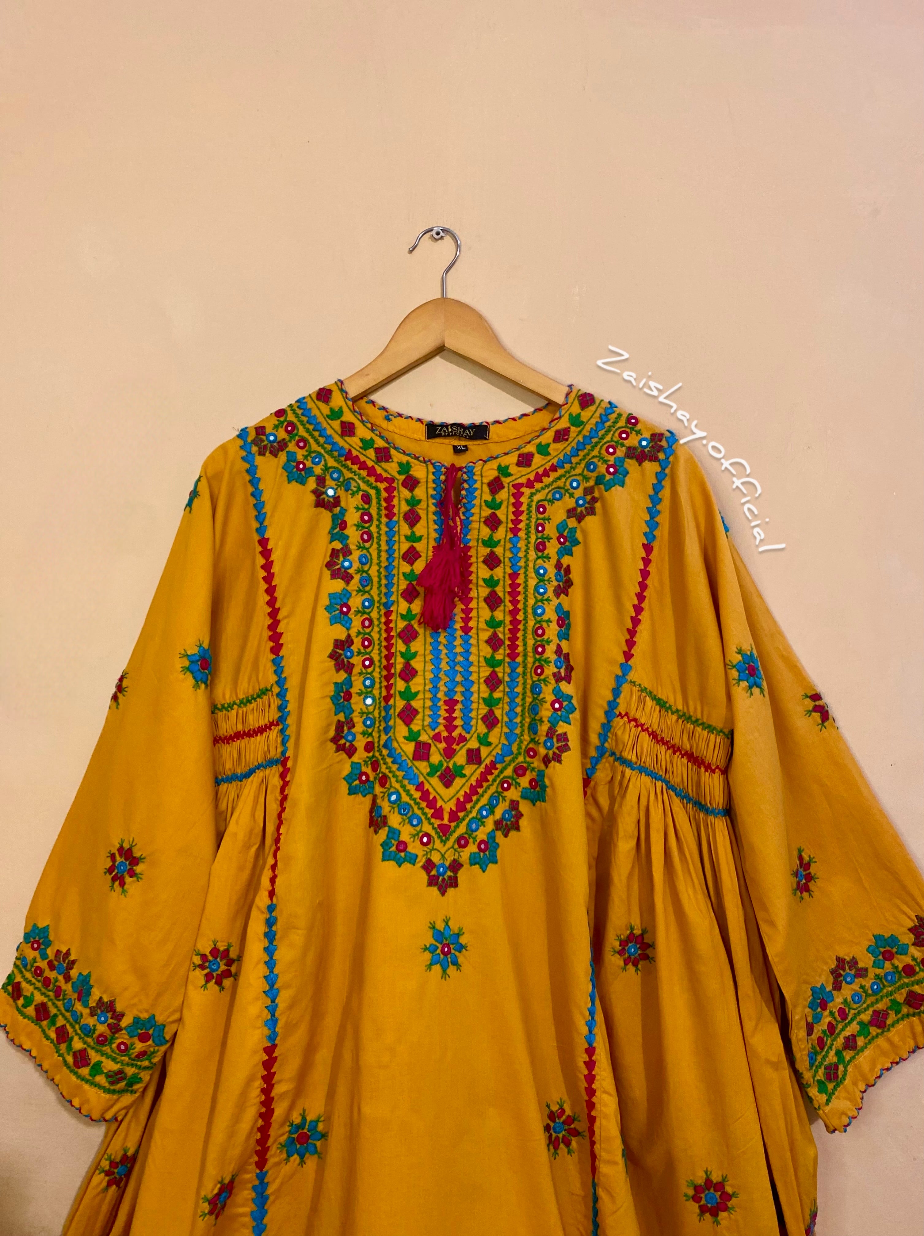 The Balochi dress, a true masterpiece of cultural heritage, showcases an intricate blend of artistry and tradition. Each garment is a testament to the skill and dedication of the artisans who bring it to life. The handwork, painstakingly executed, features delicate embroidery that tells a story through its vibrant patterns.This traditional craftsmanship is enhanced by the addition of mirror work, which adds a captivating sparkle and depth to the fabric. The result is a dress that is not only a visual delight but also a symbol of the rich artistic heritage of the Balochi people.