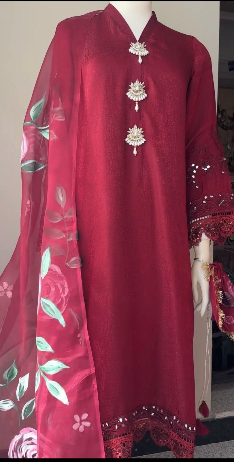 Make a bold statement in this crimson outfit on amboss silk,tailored to perfection with lace details hand painted dupatta on organza and potli