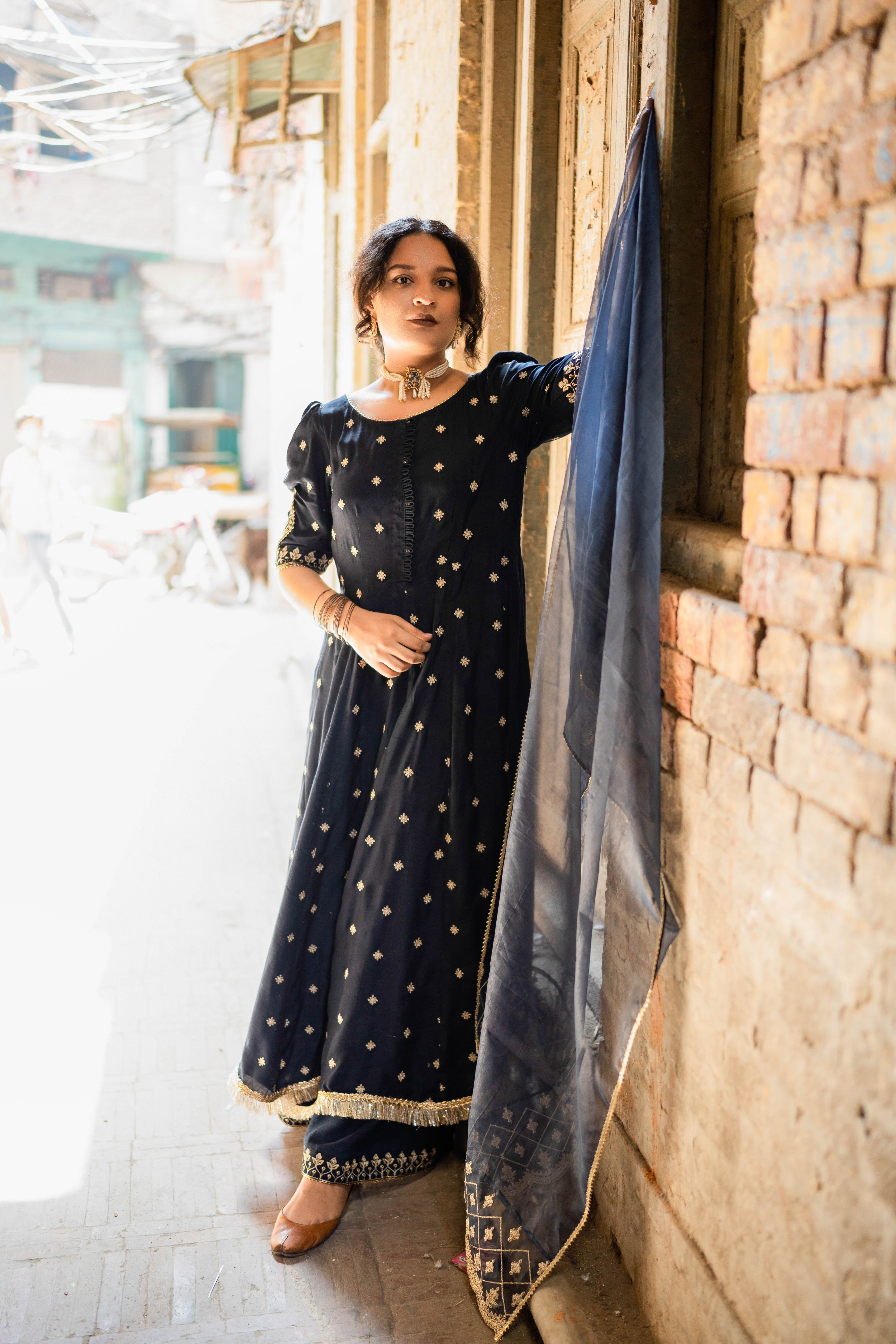 Description: BEHNAZ is a fully flared knee length peshwaz with palazzos. Peshwaz is carrying details of puffed elbow length sleeves, finished with gotta lace . peshwaz and pallazos fabric is pk raw silk. dupatta is organza with embroidered pallos.