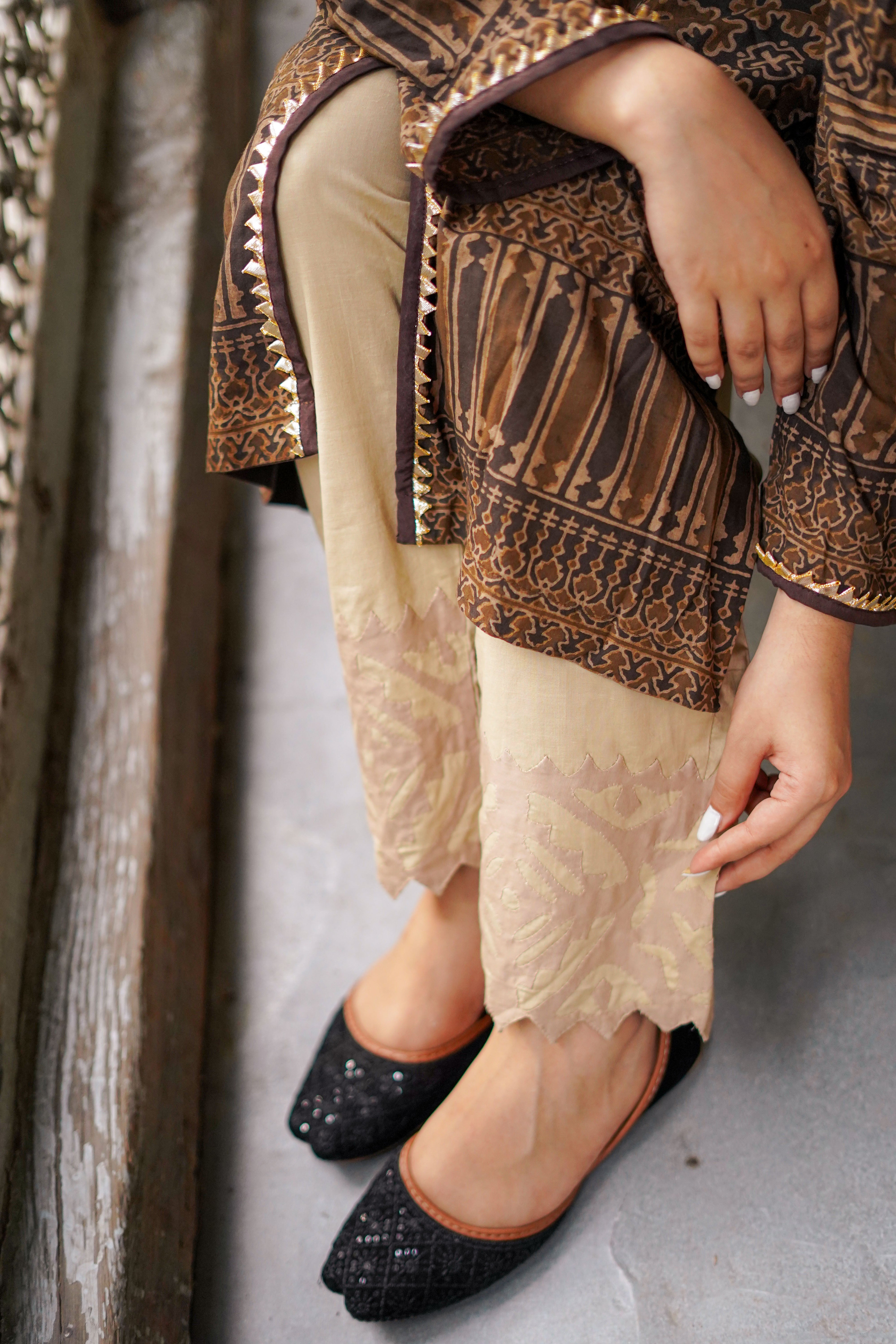Add a touch of elegance to your traditional look with our vibrant Appliqué trousers. Expertly crafted with intricate Paincha embroidery, these trousers are perfect for pairing with any Ajrak duppata and block printed shirt.