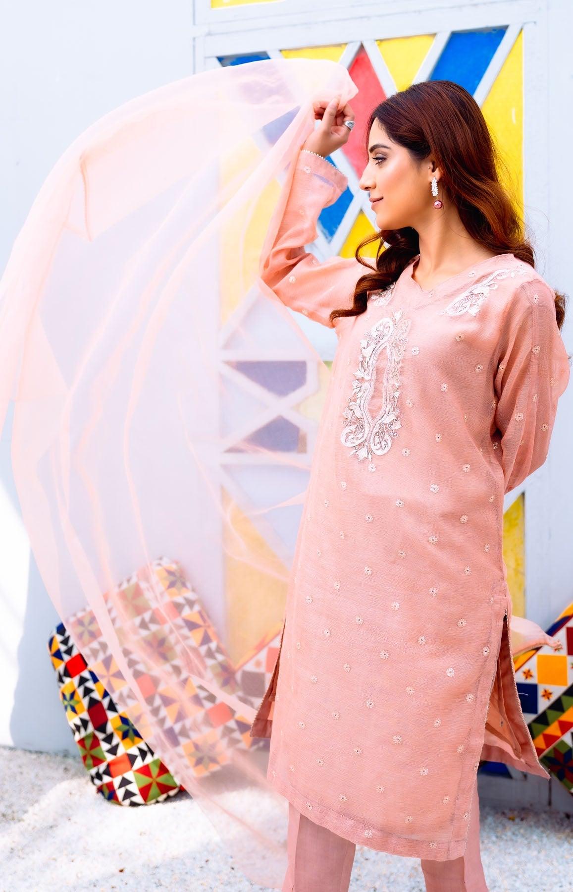 Introducing our stunning Peachy Pink Cotton Net Dress, a perfect blend of traditional and modern fashion. This elegant dress is sure to turn heads with its intricate embellishment and sequence work, meticulously crafted by our skilled artisans. The dress features a round neckline and straight-fitted sleeves that add a touch of sophistication and grace, while the soft peachy pink colour gives it a modern and refreshing feel.