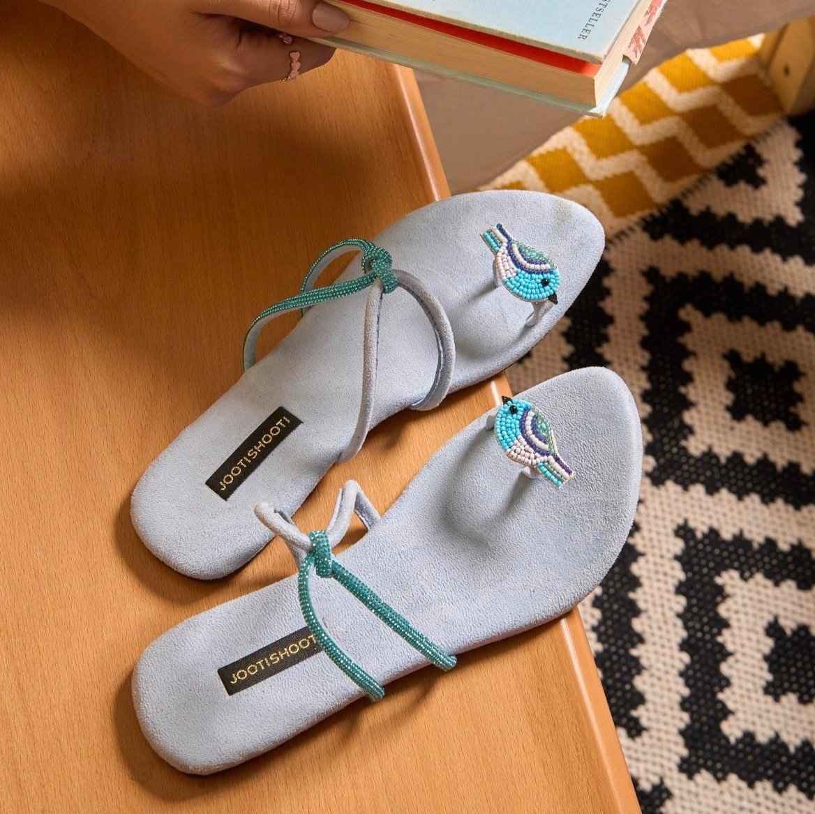 Step into comfort and style with our new slides, featuring a pastel blue suede base and an embellished strap upper. Adorned with delicate embroidered bird motifs in soft shades of blue, these slides make you feel like you're walking on a cloud. Perfect for adding a touch of elegance to your everyday look.