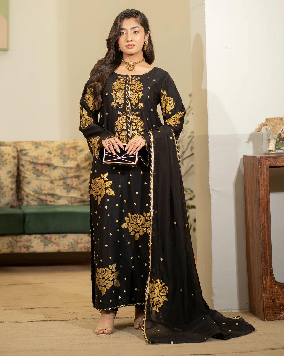 Styled with sleek straight silk trousers and a hand-painted silk dupatta framed with an organza border and sequin detailing, Black Rose is your go-to outfit for formal events and festive celebrations.
