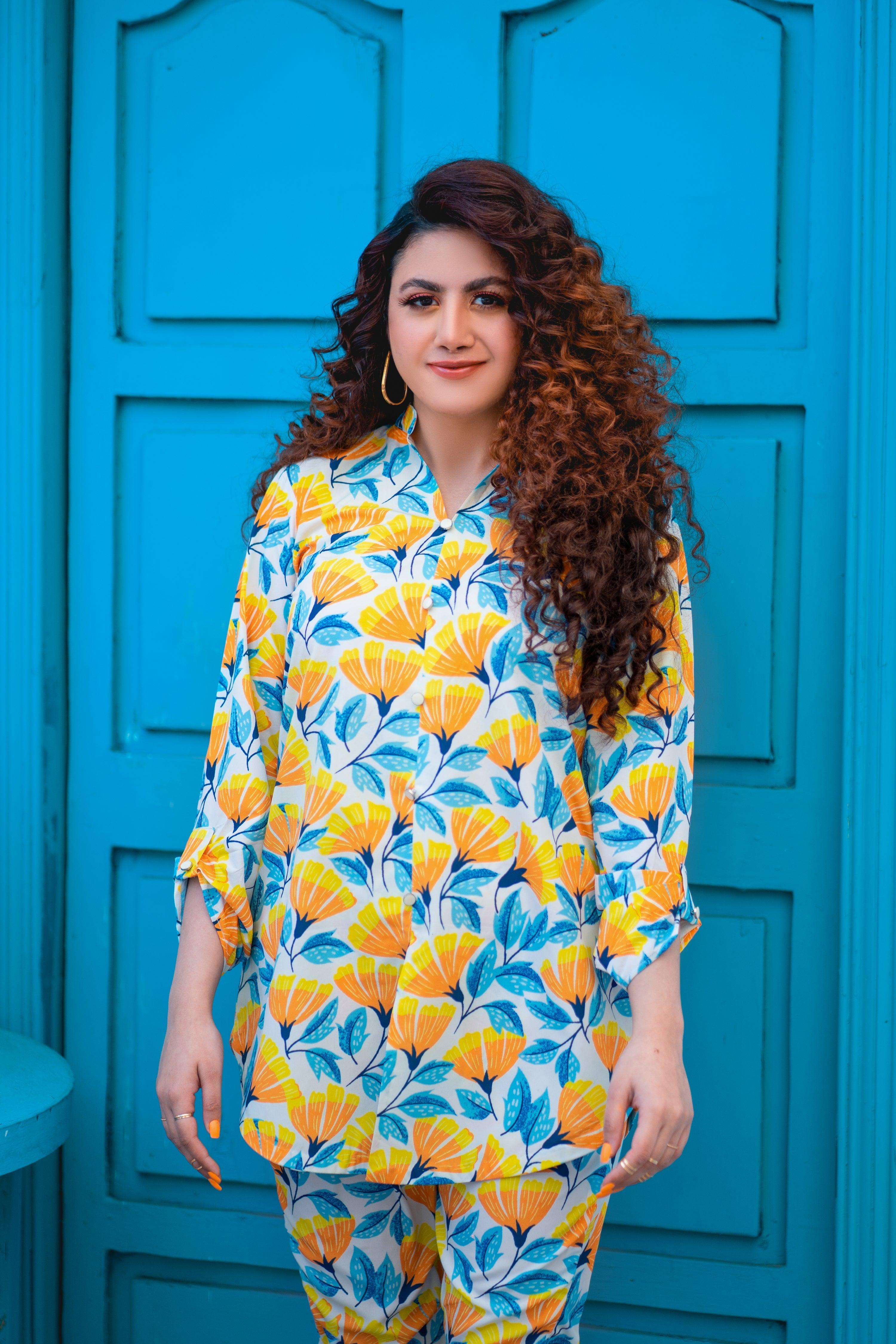 2-piece printed ensemble having band neckline with front buttons and slit. Folded cuff sleeves with epaulettes and buttons paired with pointed hem trousers. Seize the moment and make this stunning outfit a part of your collection today!