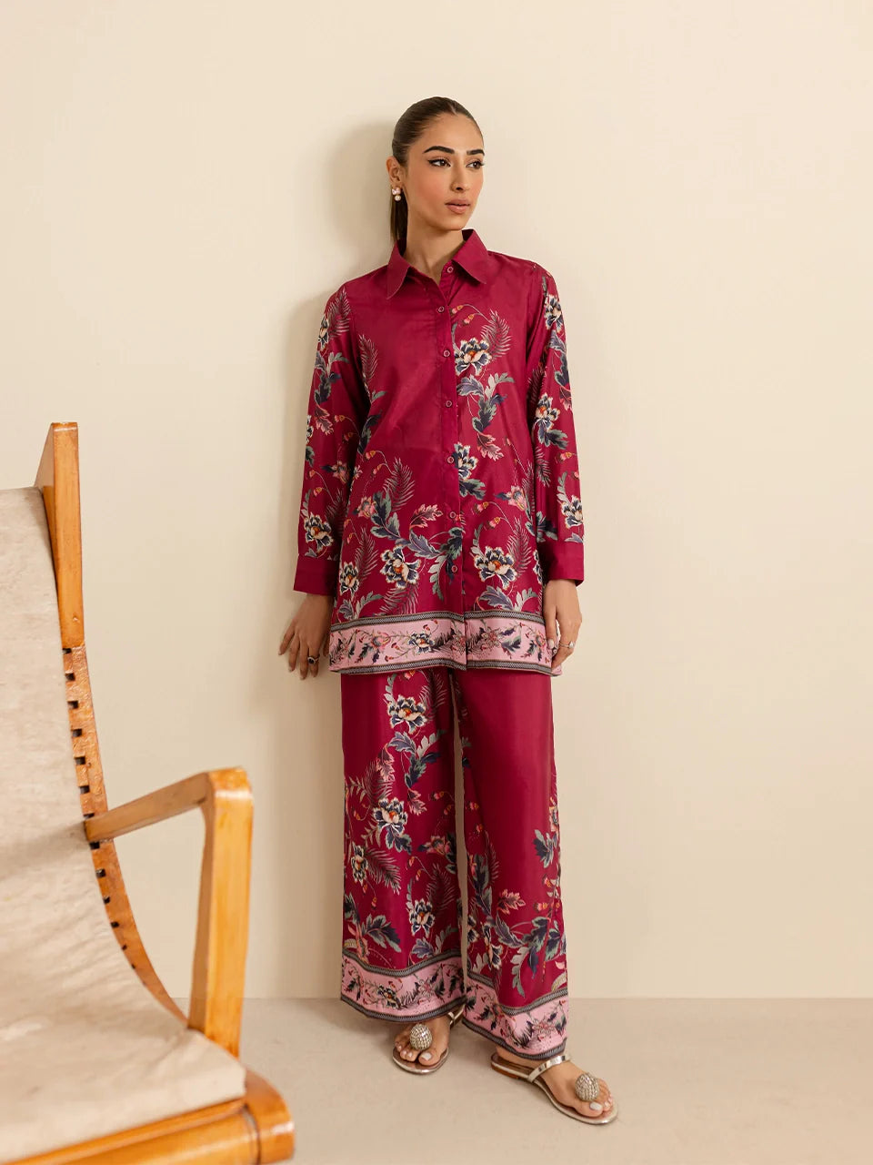 Description: This coord set features a vibrant maroon top with a striking floral print in shades of blue, white, and pink. The design is enhanced with a detailed border at the hemline, blending pink accents with intricate floral patterns for added elegance. Made from a soft, breathable fabric, the shirt is styled with a classic collared neckline, button-down front, and full sleeves, offering both comfort and sophistication. The matching trouser fabric echoes the floral print, completing the coordinated look for a chic and polished ensemble. Perfect for casual outings or semi-formal occasions