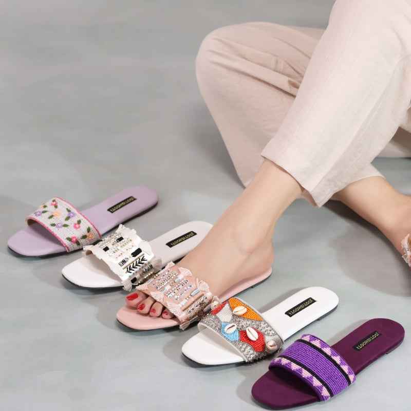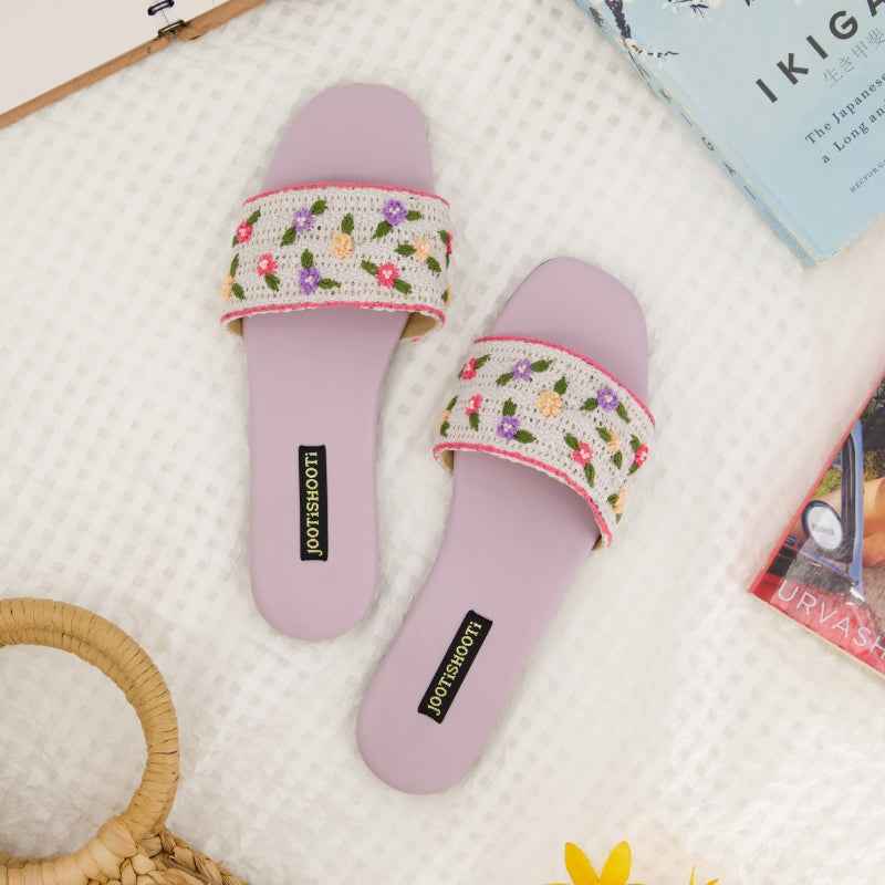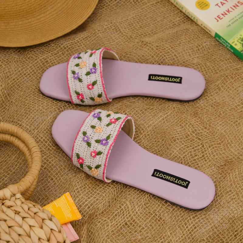 Step into summer with playful floral embroidery set on a soft lavender base, bringing vibrant boho energy to your casual days. Crafted to combine comfort and chic aesthetics, these slides effortlessly complement breezy dresses, beach cover-ups, or your favorite denim shorts. Let your feet bloom as you embrace sunny adventures.