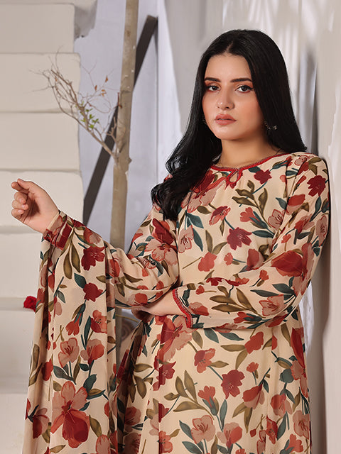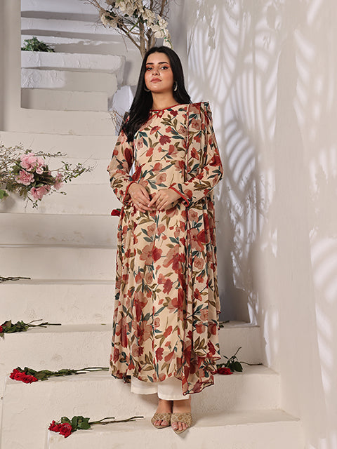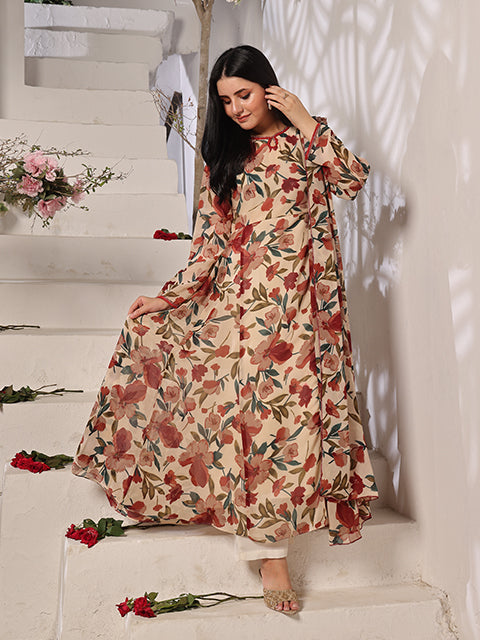 Introduce a touch of elegance and style with Calico flowers printed Chiffon maxi adorned with an lace neckline. The lace on the sleeves adds a unique and sophisticated touch. Complete the look with the paired crepe straight trousers for a stunning and comfortable outfit.