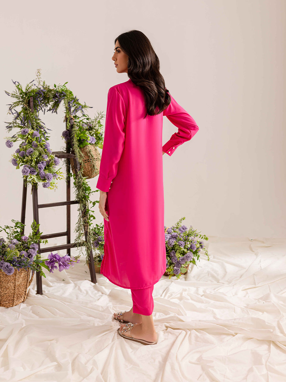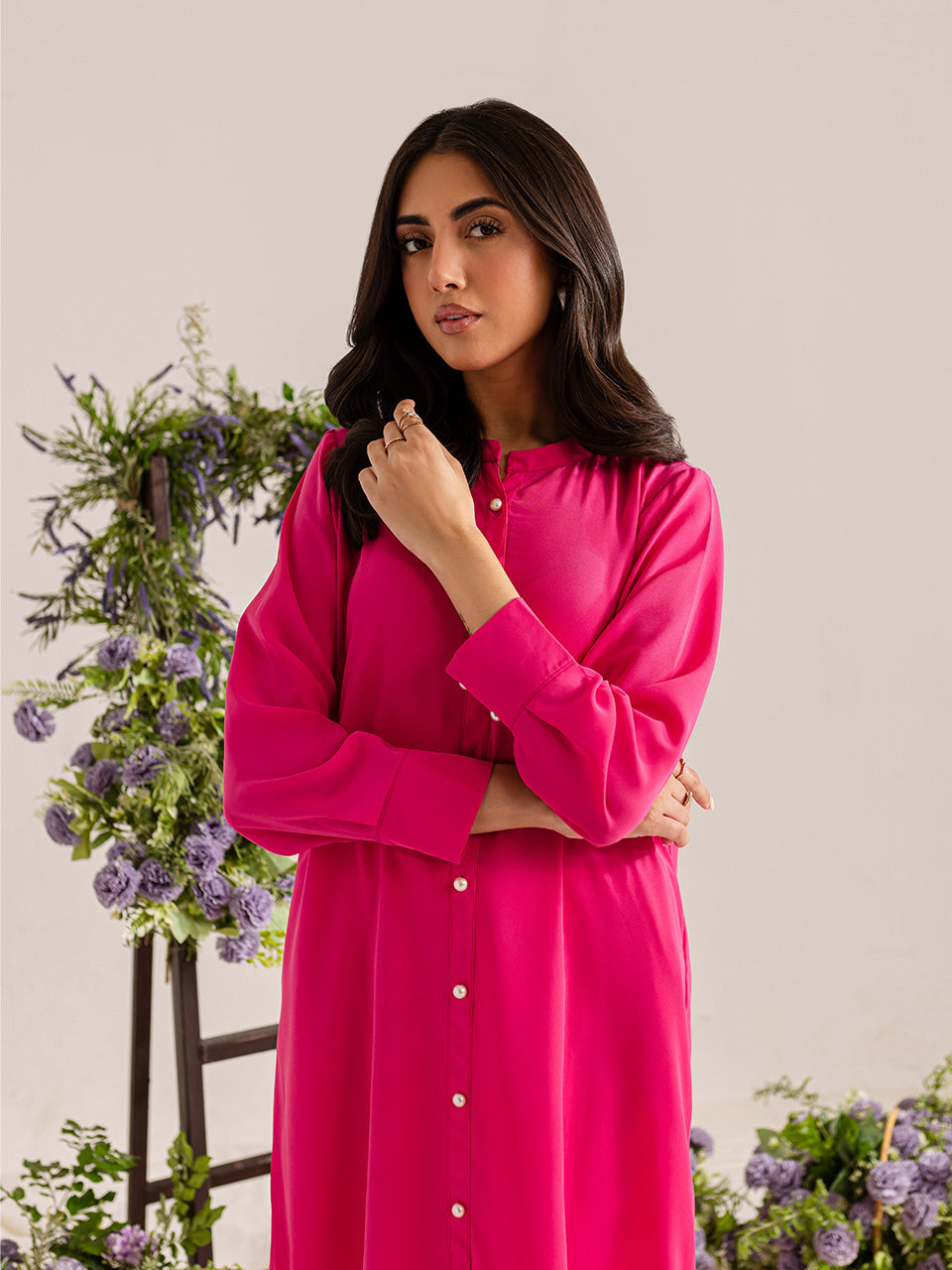 Description: The vibrant pink crepe dress combines modern elegance with a classic silhouette. With its simple round neckline and button-front detail, it transitions seamlessly from day to evening, making it a timeless wardrobe staple.