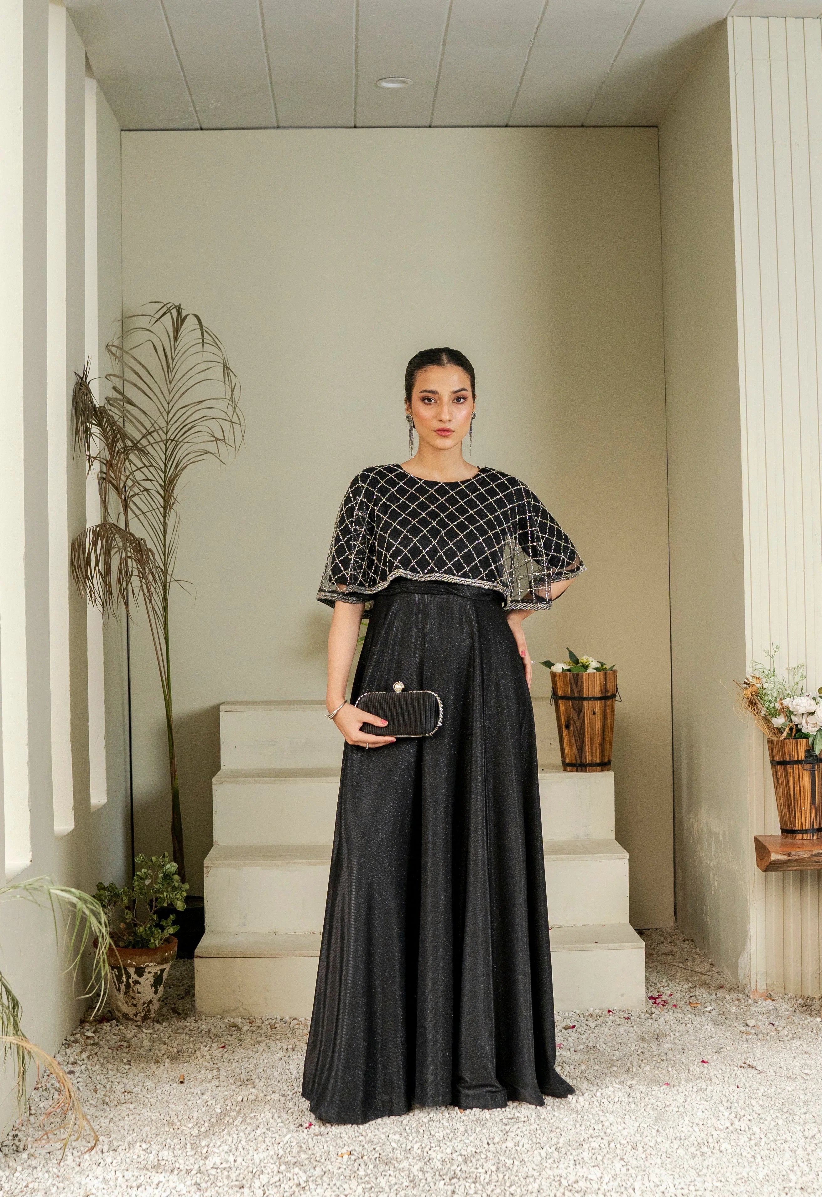 Discover "Casanova," an exquisite piece from Emeralds’ Luxury Pret collection. This stunning black gown, crafted from premium moonlight fabric, features a sleek, graceful flow that embodies sophistication. Delicate scattered embellishments add a subtle shimmer, enhancing the gown's refined aesthetic. The standout element is the intricately embellished cape, made of fine net and adorned with cut dana work and moti dana lace along the edges. The cape's diamond-patterned sequin and beadwork drapes elegantly over the shoulders, offering both stylish coverage and a chic accent to the ensemble. Perfect for evening events, this design combines modern elegance with a touch of timeless charm.