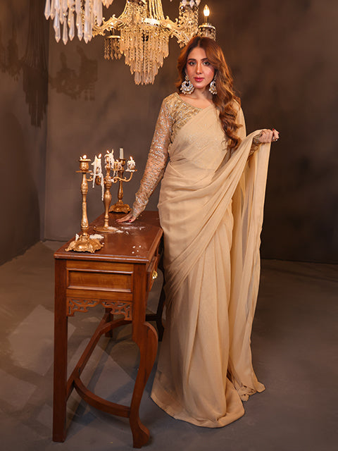 This mesmerizing camel-colored net saree, crafted from an ultra-soft and feather-light fabric, flows effortlessly with every movement. Its sheer, airy texture creates an ethereal silhouette, radiating understated elegance. Paired with a delicately embroidered blouse, adorned with intricate detailing, it strikes a perfect balance between subtle luxury and timeless grace.