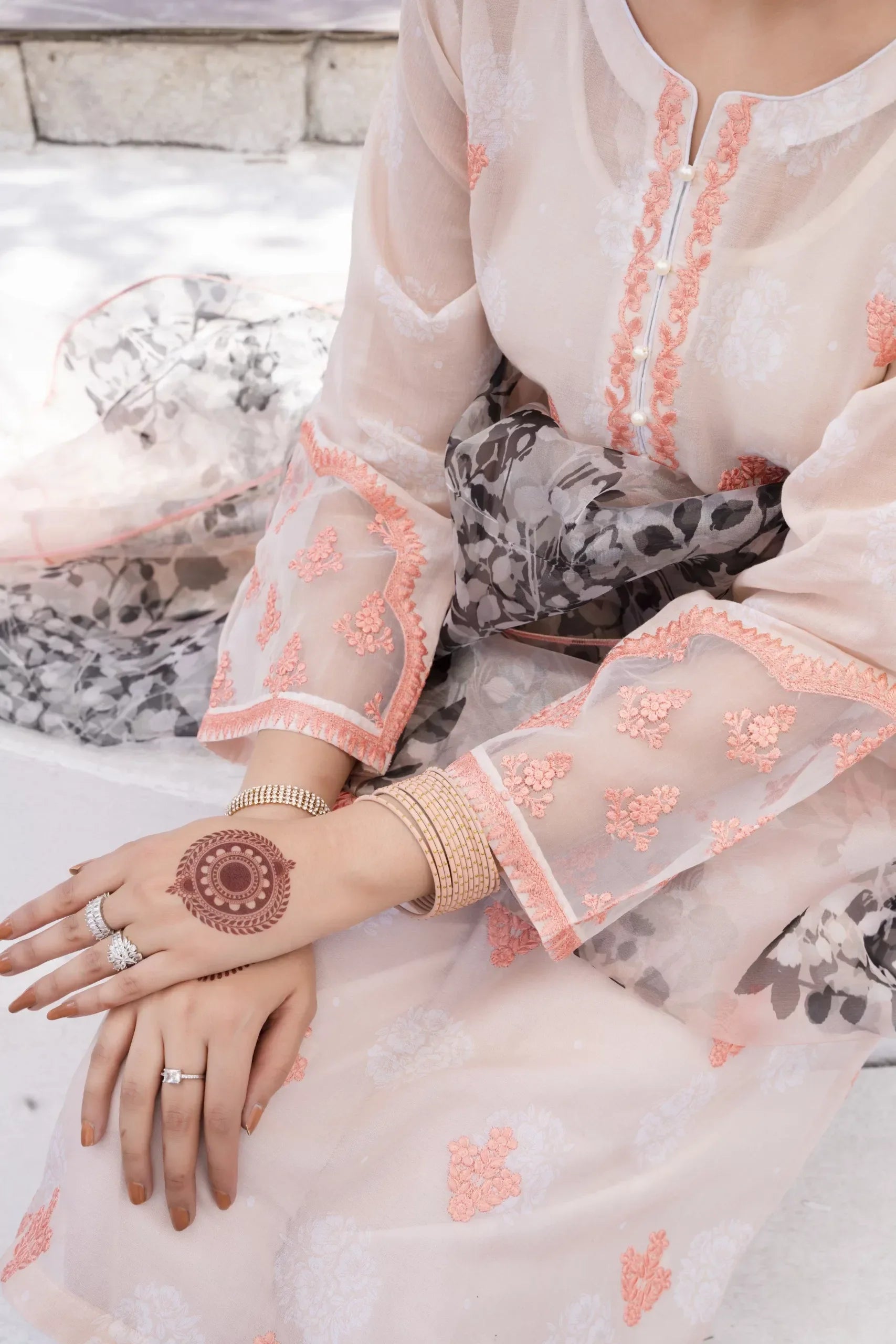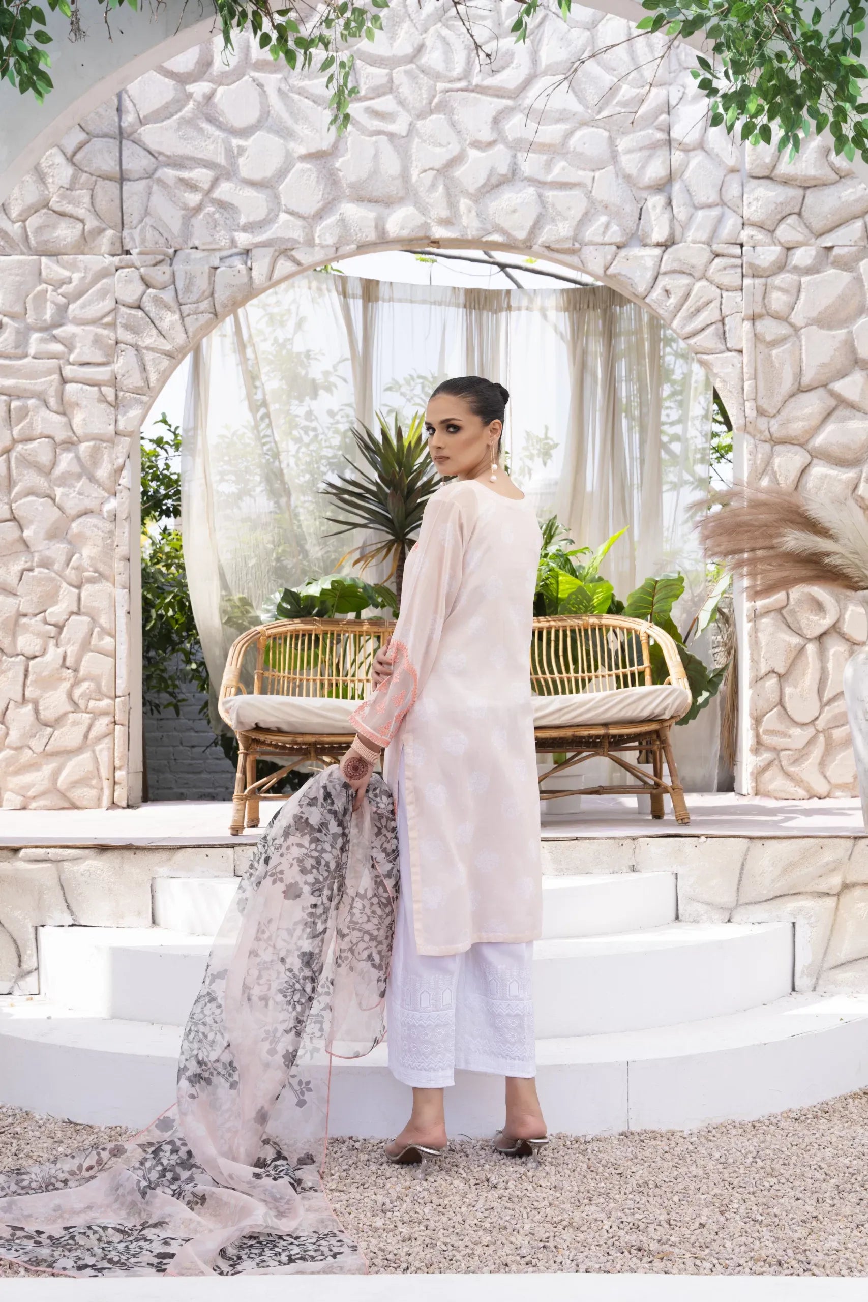 The Champagne Peach Hued Shirt, adorned with Peach color Embroidery on the front, comes with a Straight Embroidered Trouser and a Blended Organza Tissue Dupatta - an ideal summer outfit for gatherings and friend meetups. The details include Embroidered Front, Embroidered Full Sleeves, and Embroidered Trouser. The Straight Shirt is Peach in color and made of Swiss Lawn, while the Straight Trouser is White and made of Cotton. The Dupatta features a multi-colored Peach design and is made of Tissue Organza.