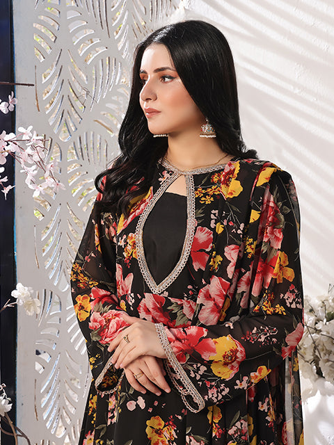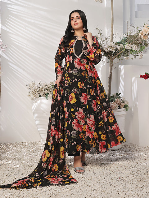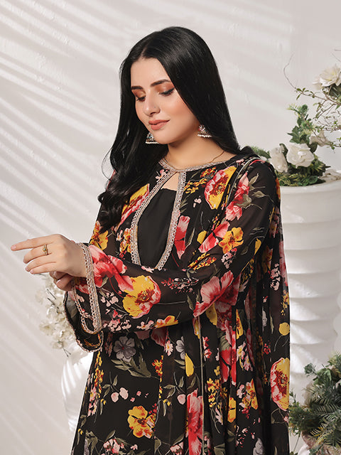 Introduce elegance into your wardrobe with "Charcoal charm flowy dress" rendered on an Charcoal canvas. The chiffon maxi features an Oval neckline with lace features, further enhanced by Charcoal floral print. Bursting. paired with crepe trouser and chiffon dupatta .