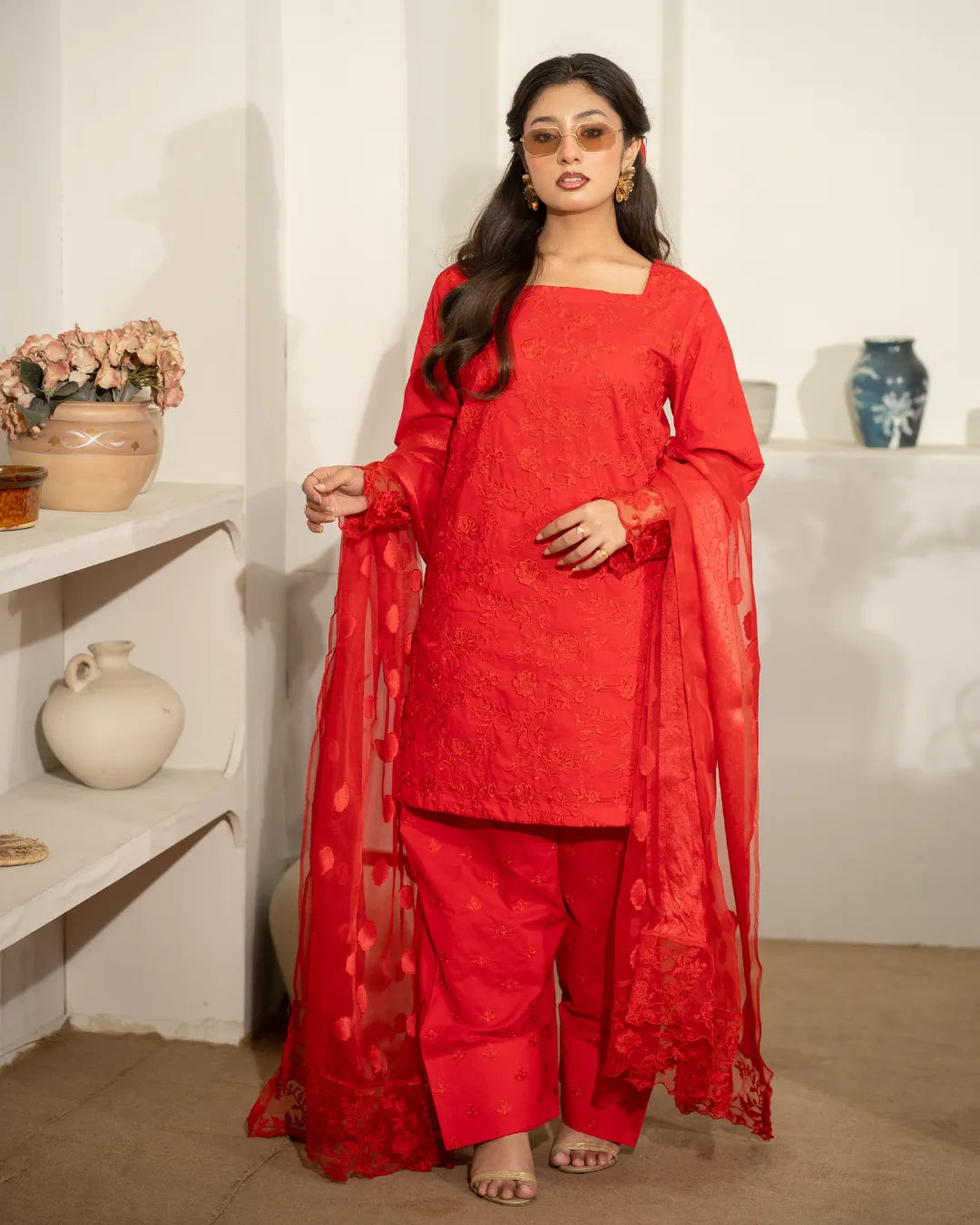 Embrace effortless elegance with Cherry — a bold red Swiss lawn ensemble crafted for festive summer gatherings, brunches, and formal get-togethers.