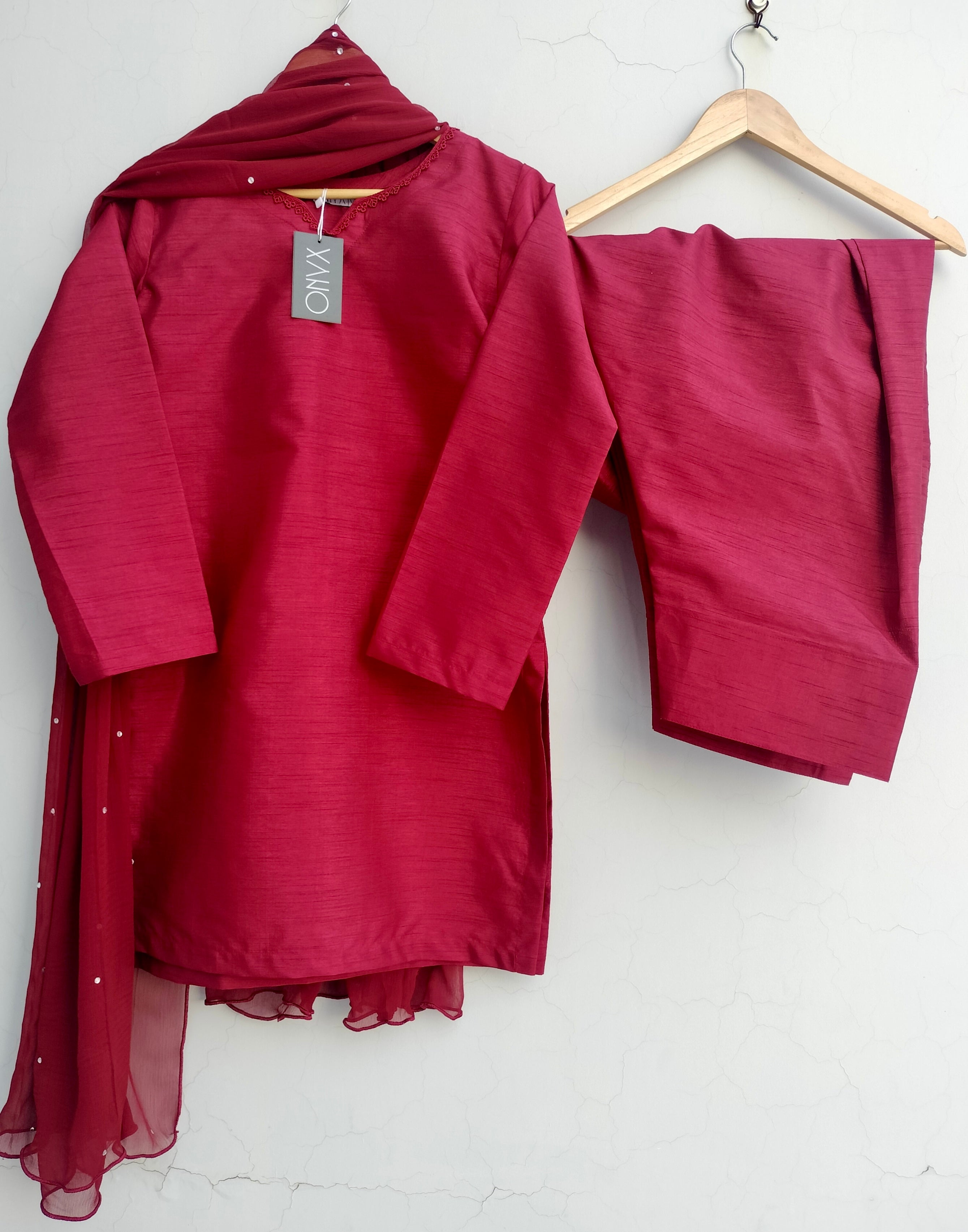 A luxurious South Asian ensemble featuring a Lawn kameez with lace-detailed neckline, paired with a voluminous farshi shalwar. The chiffon dupatta dazzles with intricate stonework, adding a touch of glamour. This crimson masterpiece blends traditional craftsmanship with modern elegance.