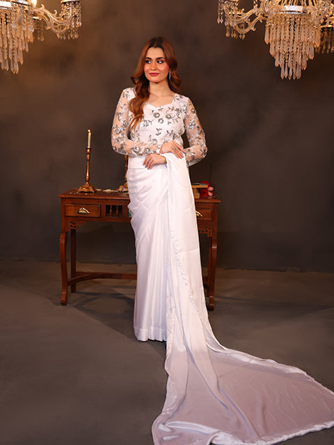 This pristine white silk saree embodies grace with its smooth, luminous fabric that drapes effortlessly. Its subtle sheen adds a touch of sophistication, making it a symbol of timeless beauty. Paired with a delicately embroidered blouse, it creates an enchanting blend of purity and refinement, perfect for any elegant occasion.