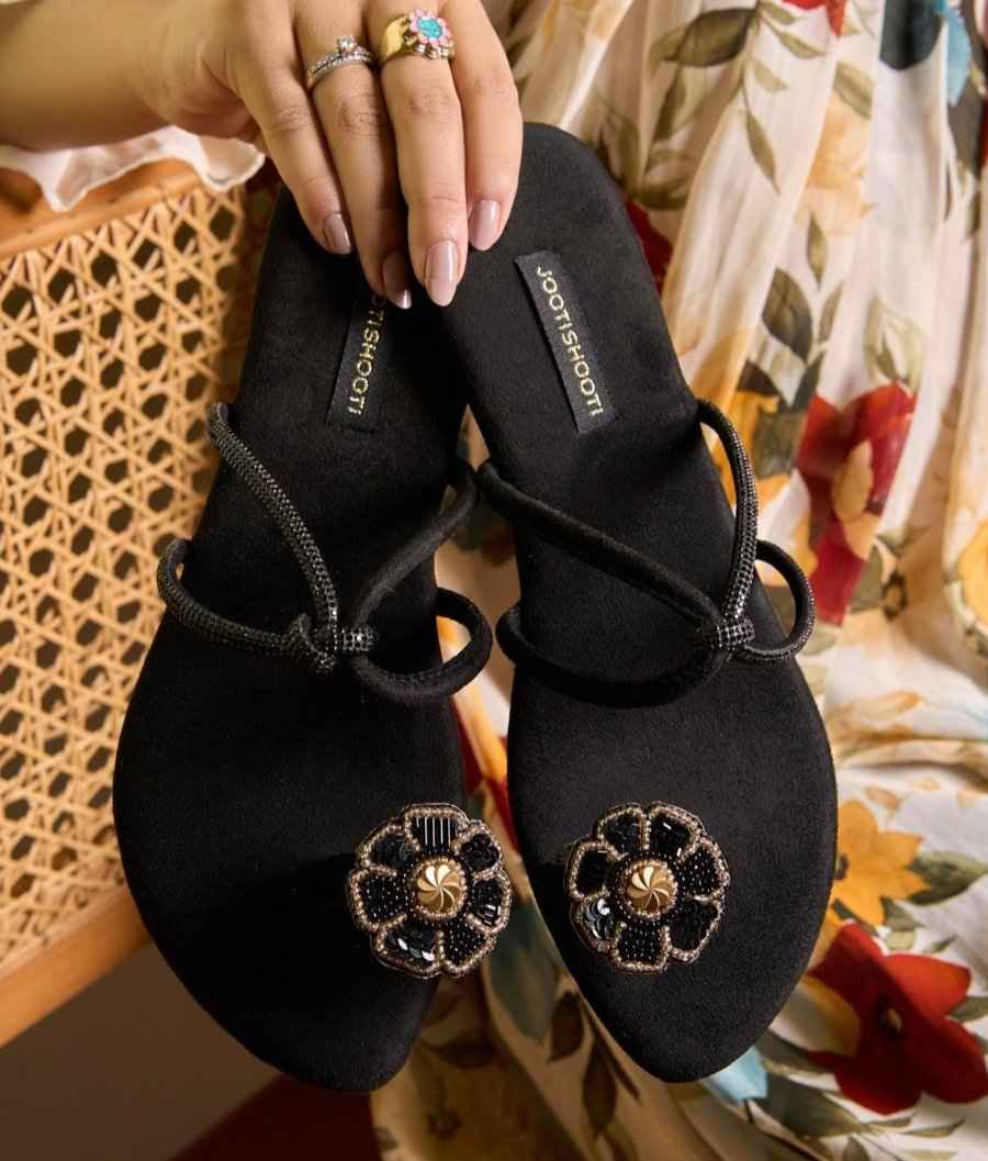 Designed with a rich black suede base and embellished straps these slides are adorned with an intricate black and gold embroidered and embellished floral motif, these slides are the perfect classic pair for your summer outfits.