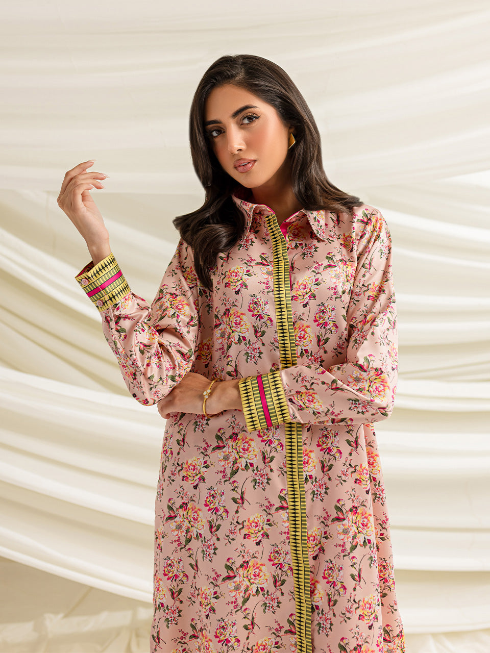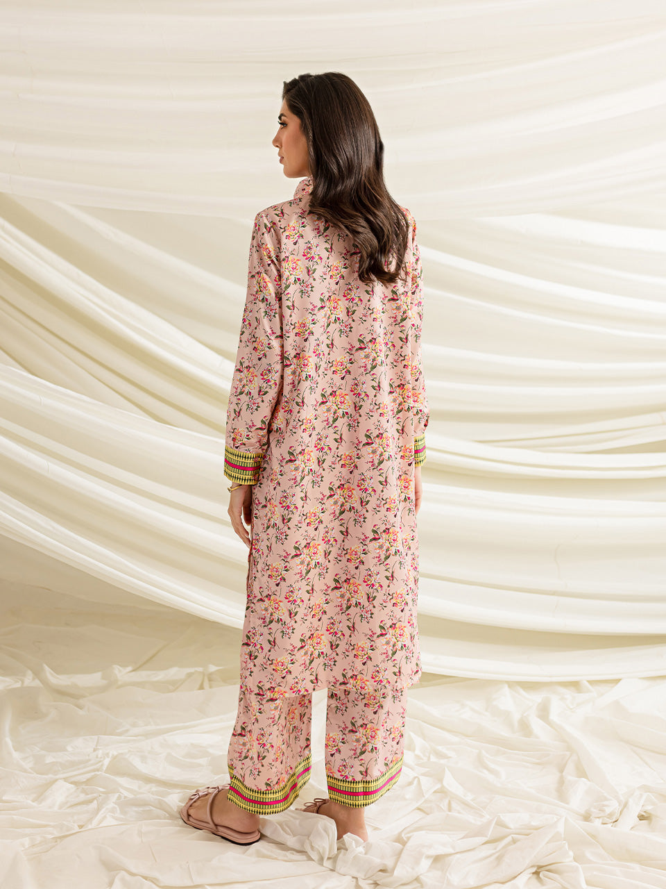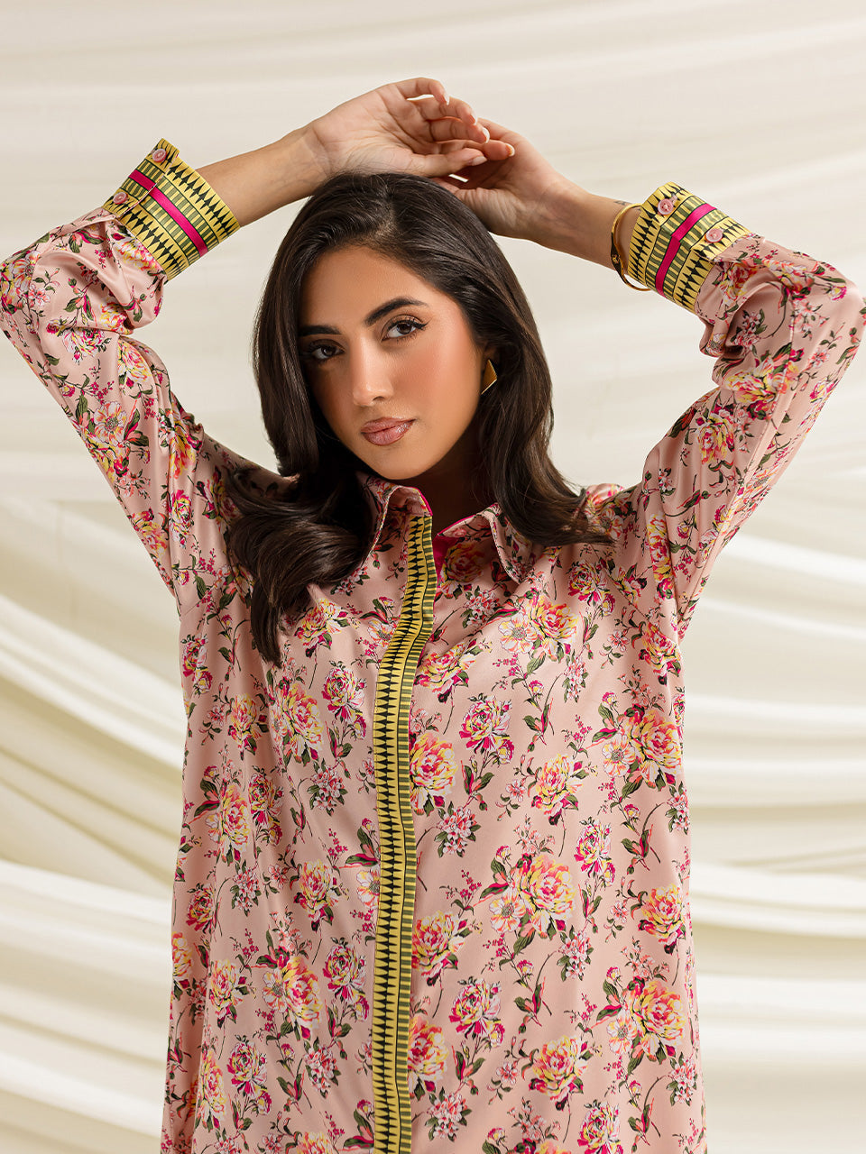 Description: This pink silk outfit features a soft floral print with vibrant striped trims on a tunic and wide-legged pants. The intricate detailing and flowy fabric offer a blend of traditional elegance and modern flair.