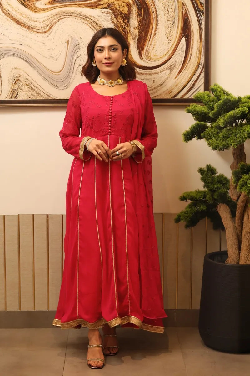 2 Pc – Hot Pink Embroidered Chiffon Pishwas with Embroidered Chiffon Dupatta