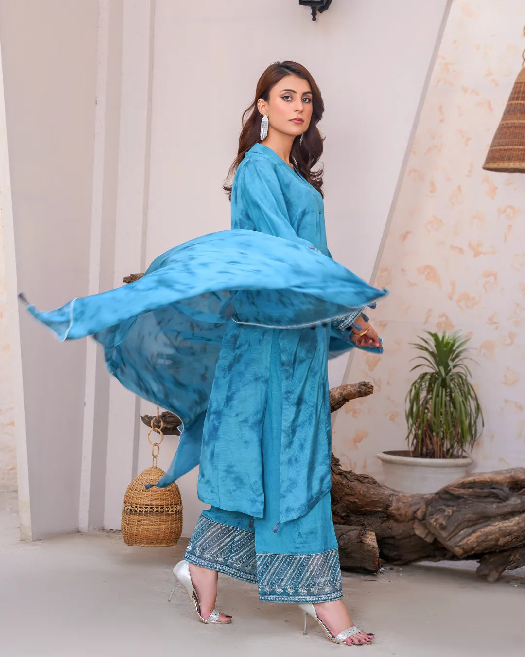 Ocean Blue Tie-Dye 3-Piece Raw Silk Embroidered Dress, a timeless ensemble that blends traditional craftsmanship with contemporary design. This exquisite outfit features: Shirt: Crafted from premium raw silk, showcases an elegant tie-dye pattern in soothing ocean blue hues. Intricate embroidery embellishes the sleeves and hanging tussles adding a touch of sophistication and grace to this piece