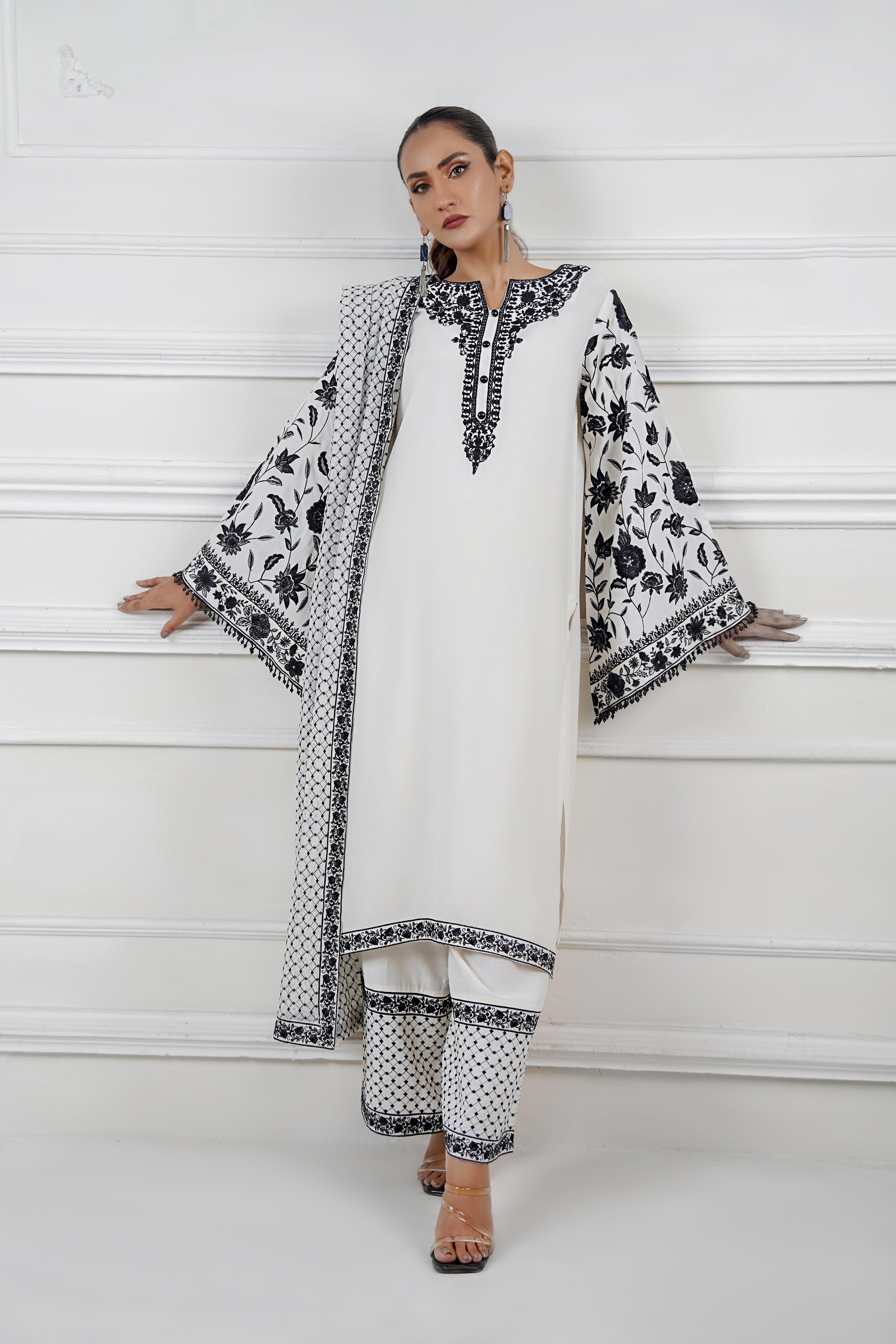 The outfit has detailed embroidery on the neckline, sleeves, and upper garment hem, while the trousers boast border embroidery. The dupatta is adorned with intricate embroidery, showcasing a beautiful pattern or design.