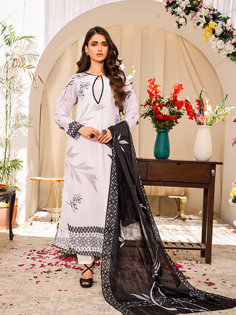 This sophisticated black and white shirt features a striking digital print, with delicate floral accents gracing the corners. A pointed-cut lace neckline adds refined elegance, while the black dupatta completes the chic ensemble. “Ébène Fleurie” blends modern artistry with timeless grace.