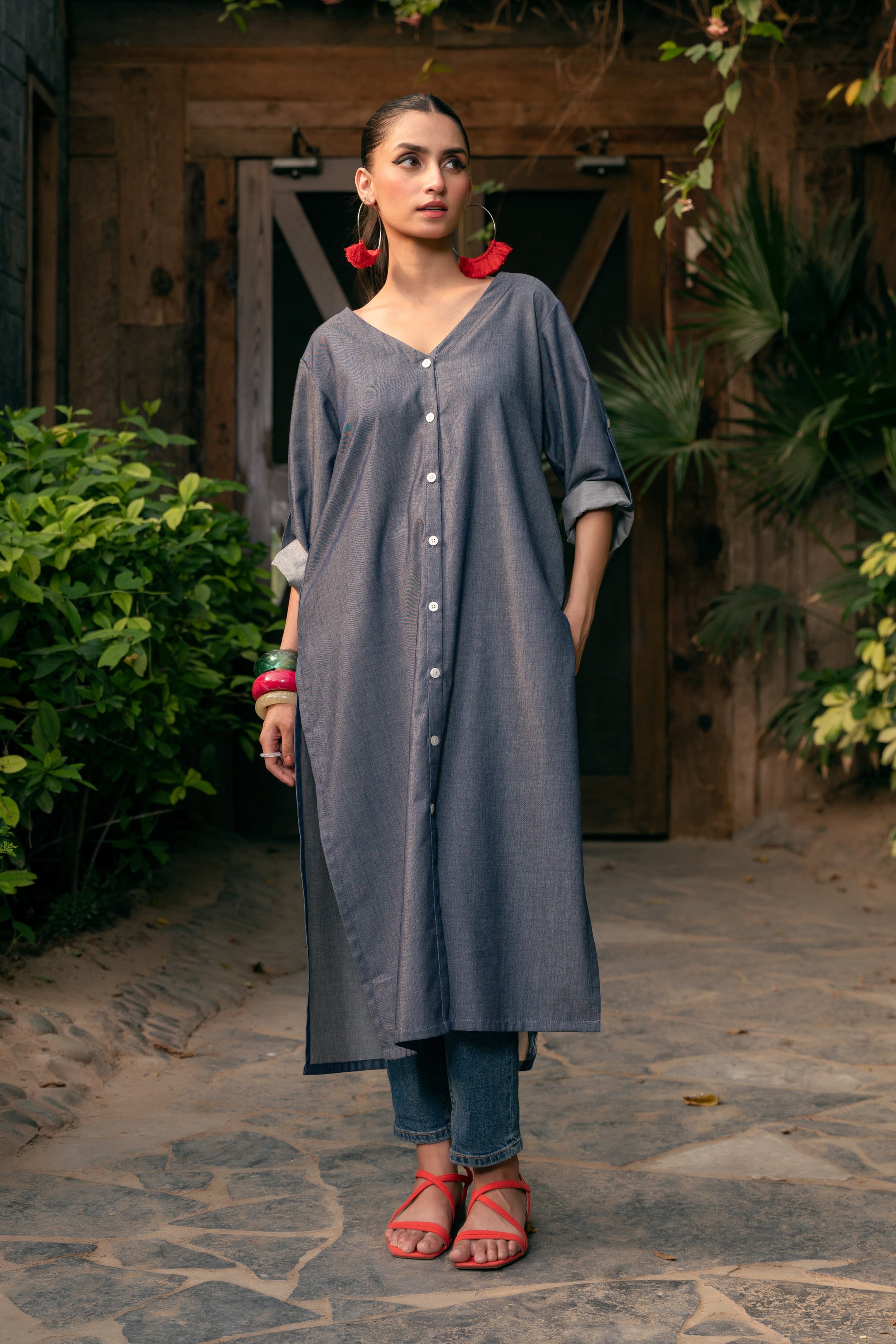 Blue V-neck long denim shirt with embroidered back and side pockets is extremely comfortable and easy to wear. A light weight choice for any daily activity.