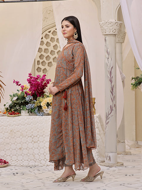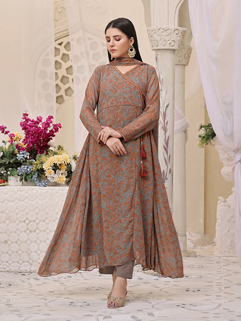 Introduce elegance into your wardrobe with "Enchanted Moss" rendered on an brown canvas. The chiffon maxi features an angharkha collar neckline, further enhanced by blooming floral print. Bursting. paired with crepe trouser and chiffon dupatta .