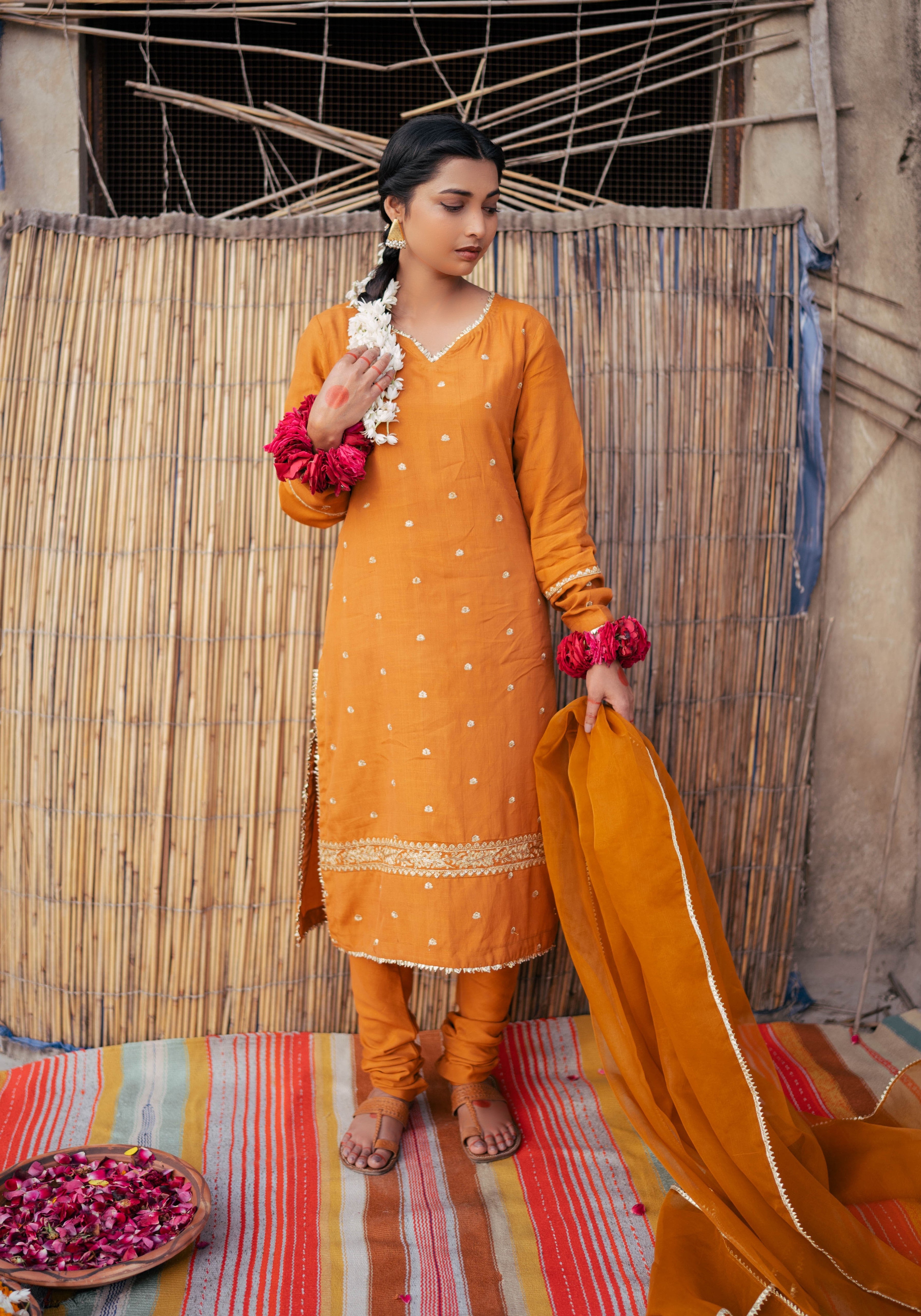 GHAZAL- FARNAZ is a long shirt paired with choori pajama and organza dupatta. Fabric for shirt and pajama is pk raw silk embellished with gold tilla embroidery and sequins, stitched in a stylized way, finished with lace. Dupatta is organza finished with lace.