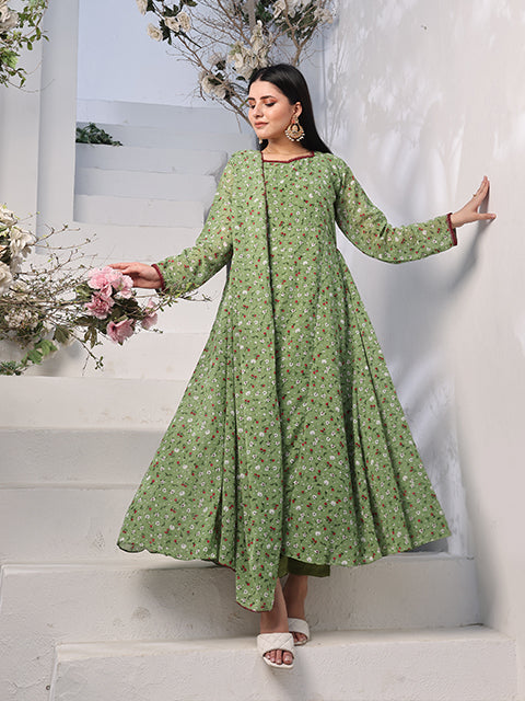 Presenting "Fern day lilies" – a spellbinding dress in a rich, enchanting green tone. The chiffon maxi is adorned with a meticulously neck , creating a dazzling design. The sleeves are elevated with delicate lace, adding an exquisite touch. Paired with crepe bottoms, the ensemble is completed with a chiffon dupatta.
