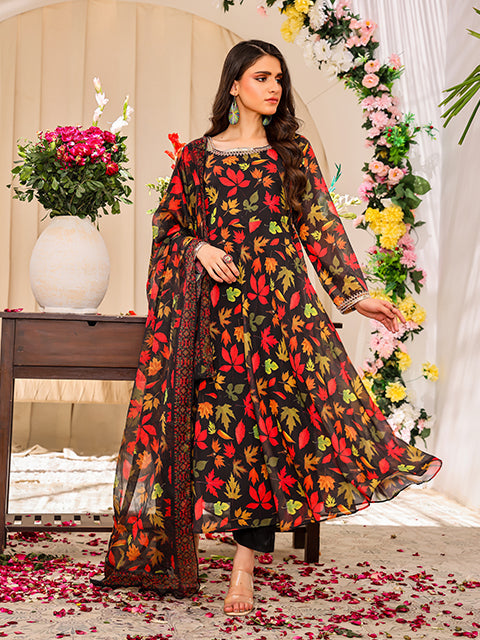 This stunning black frock embraces the warmth of autumn with its delicate leaf print, evoking the beauty of falling golden hues. A lace-adorned neckline adds a touch of elegance, while the flowing dupatta completes the look. “Feuille d’Automne” is a perfect blend of seasonal charm and timeless sophistication.