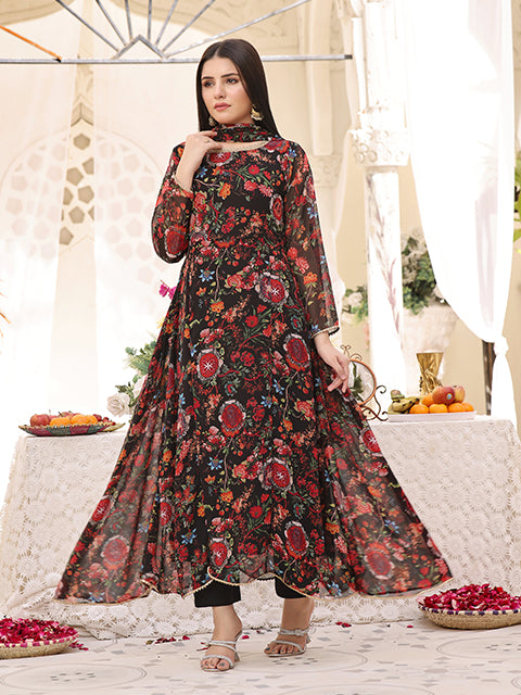 Introduce a touch of elegance and style with floral fantasy printed Chiffon maxi adorned with an lace neckline. The lace on the sleeves adds a unique and sophisticated touch. Complete the look with the paired crepe straight trousers for a stunning and comfortable outfit.