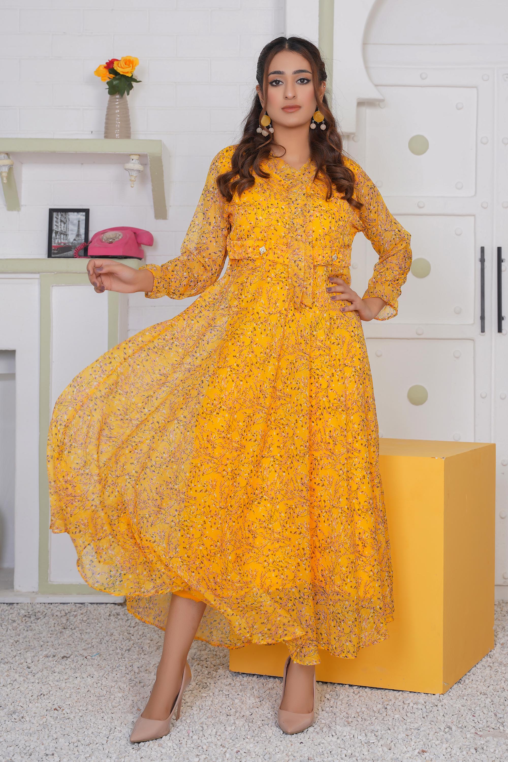 This yellow maxi dress features a lively pattern of pink petals throughout. The V-neckline and a belt design with golden bunches add a chic and stylish touch, making it perfect for a bright and elegant look.
