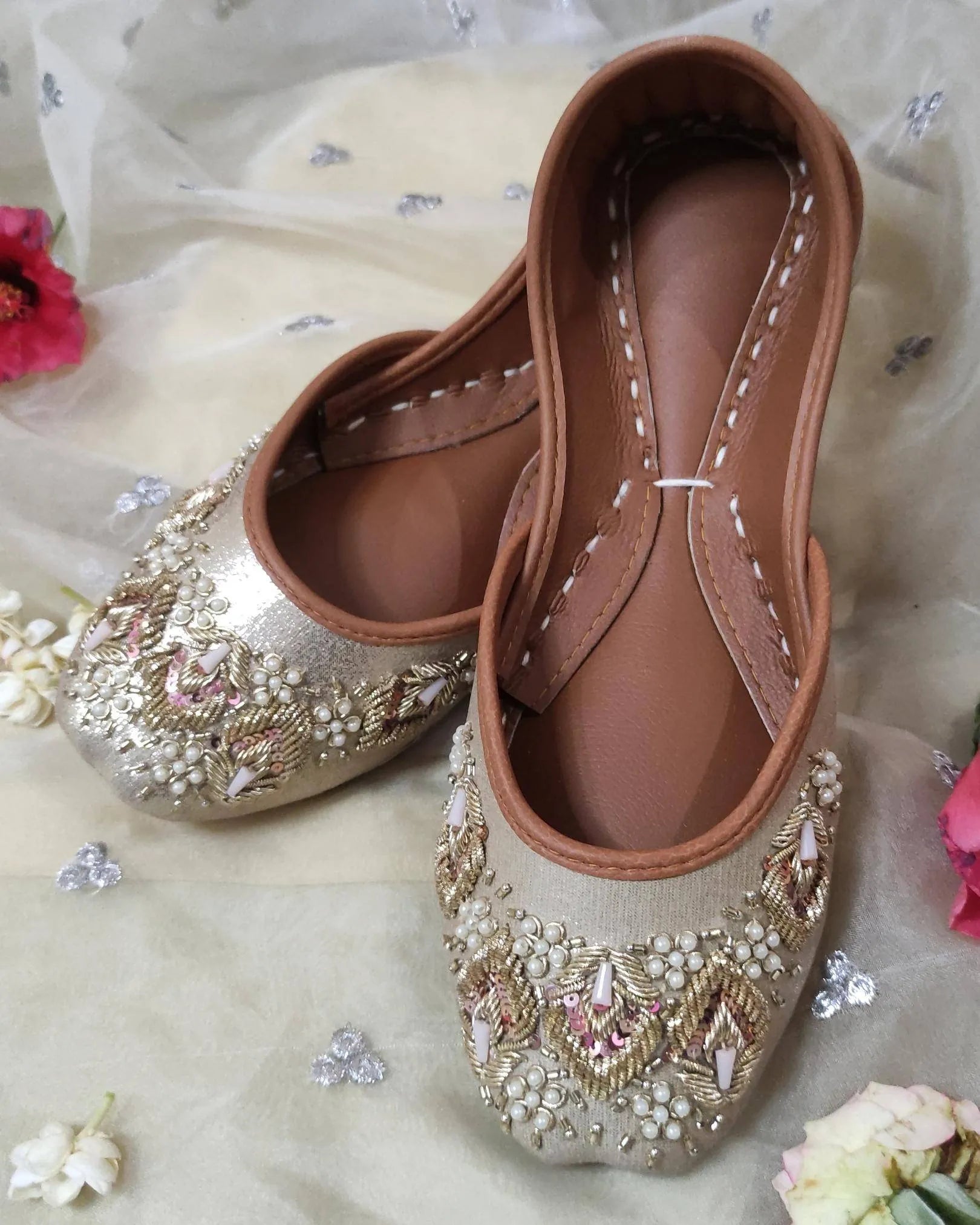 Traditional & detailed Embellished Khussa, Golden dabka, katdana, pearls and sequins on moonlight silk base along with soft cushion padding to make it perfect Khussa.