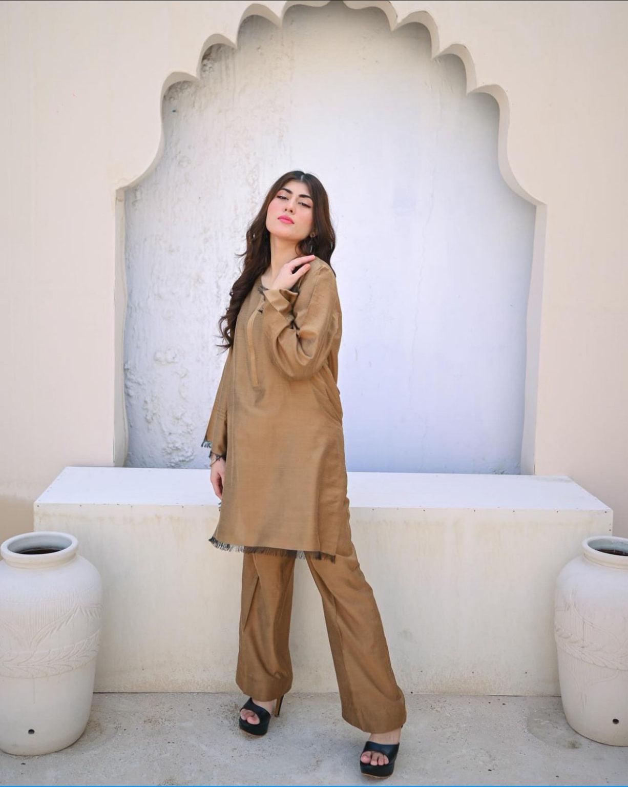 Golden matching set includes lose fit shirt with 2 side pockets along with culottes in-house khadi cotton fabric suited for winters.