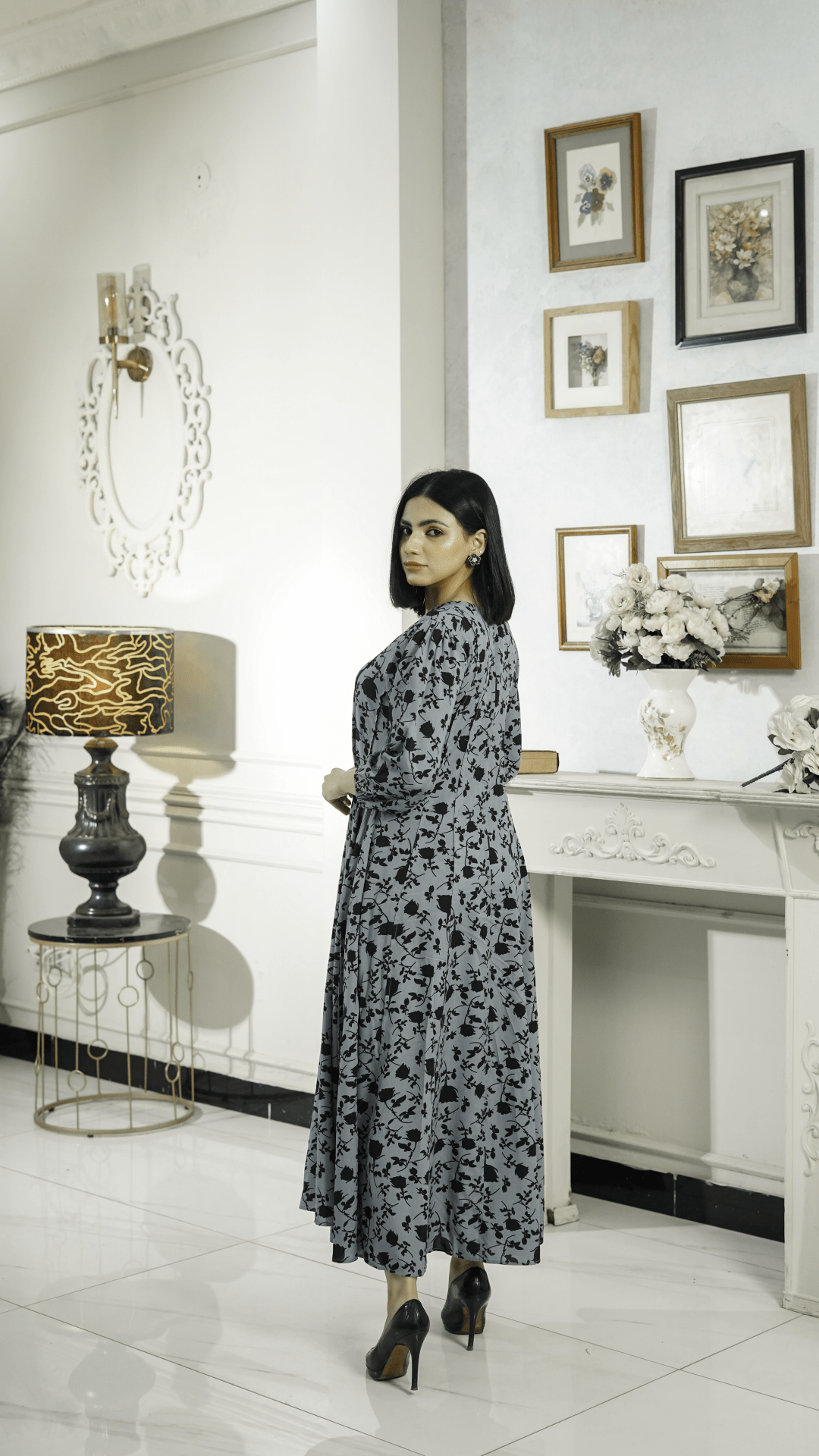 Add charm to your wardrobe with this elegant floral print maxi dress. Featuring a delicate pattern on a soothing grey-blue base, this dress boasts a flattering flowy fit and long puffed sleeves for a touch of sophistication. The subtle V-neckline adds a graceful finish, making it perfect for casual outings or semi-formal occasions.