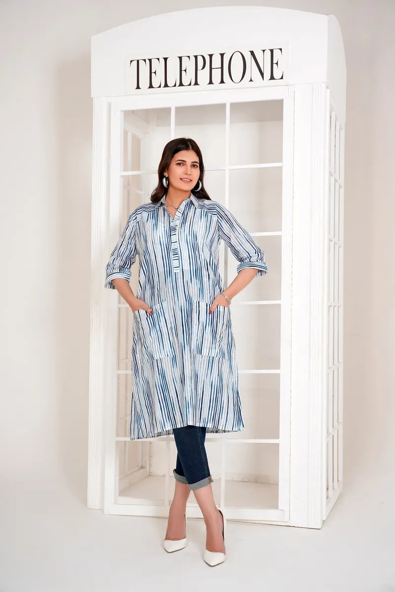 The fusion blue stripe long shirt for women is a stylish blend of tradition and modernity. This shirt features a crisp collar and a distinctive blue stripe pattern that captures the essence of both Western elegance and Eastern intricacy. The long, flowing design offers a flattering silhouette, while the addition of practical pockets provides convenience without compromising on style. Perfect for a variety of occasions, from casual outings to more formal events, this versatile piece can be paired with Jeans, leggings, trousers. The