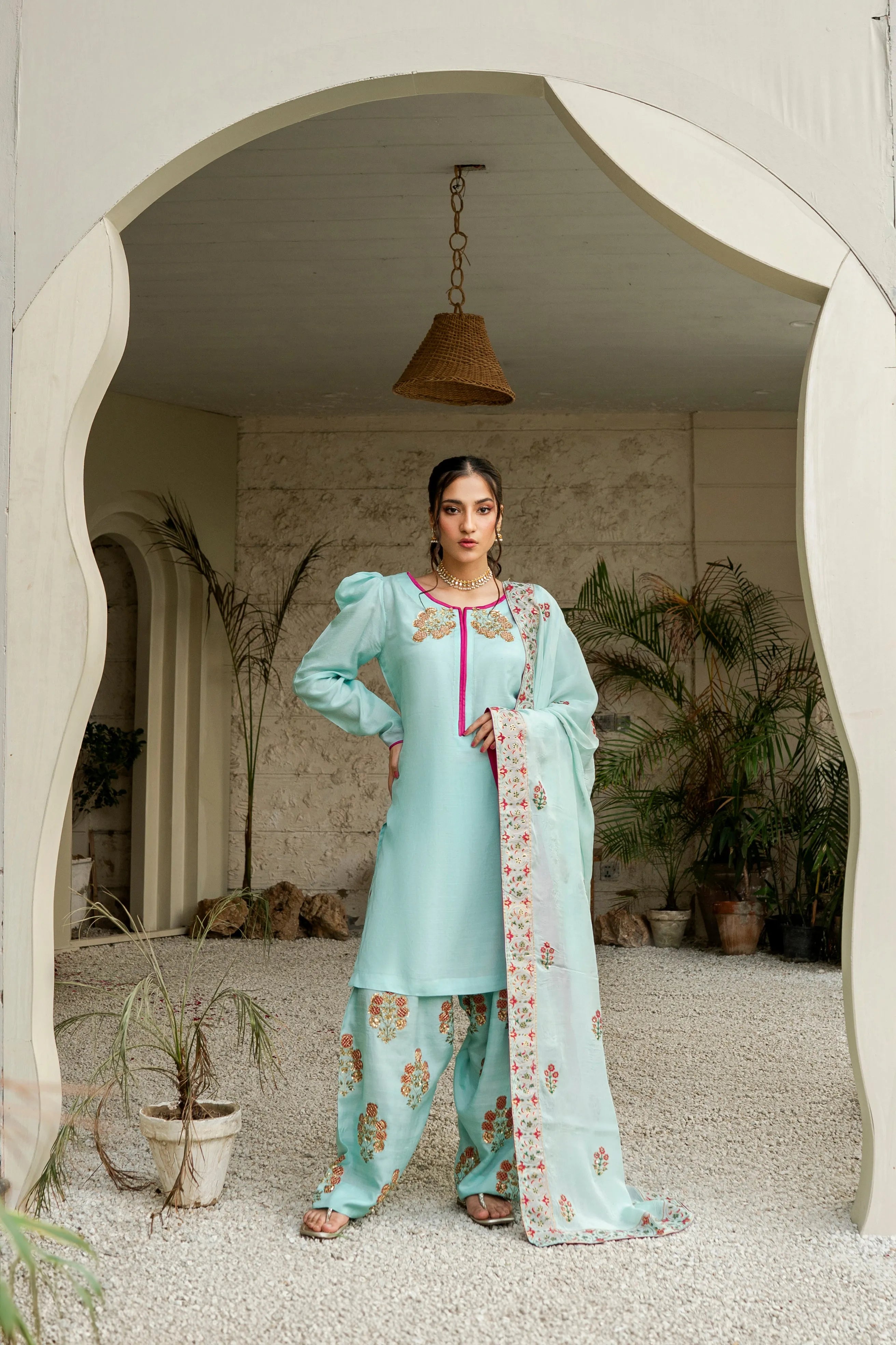 This exquisite ensemble from Emeralds, crafted from luxurious raw silk, combines the timeless art of block printing with meticulous hand embellishments through adda work. The soft aqua-blue kurta features delicate gold and pearl accents around the neckline, enhancing the hand-blocked floral motifs with a touch of opulence. The matching Shalwar carry the same intricate block print, adorned with subtle embellishments that elevate the overall design. Paired with a contrasting deep maroon dupatta, beautifully embroidered with intricate floral patterns, this outfit seamlessly merges tradition with modern aesthetics. Perfect for festive occasions, this piece showcases the artistry of handwork and the elegance of block printing.