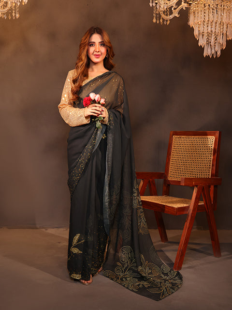This exquisite digital-printed silk saree showcases vibrant hues and intricate patterns on a luxuriously smooth, flowy fabric. Its rich texture and effortless drape exude modern grace, perfectly complemented by a shimmering sequined blouse. The blouse catches the light with every movement, adding a touch of glamour to this elegant and contemporary ensemble.