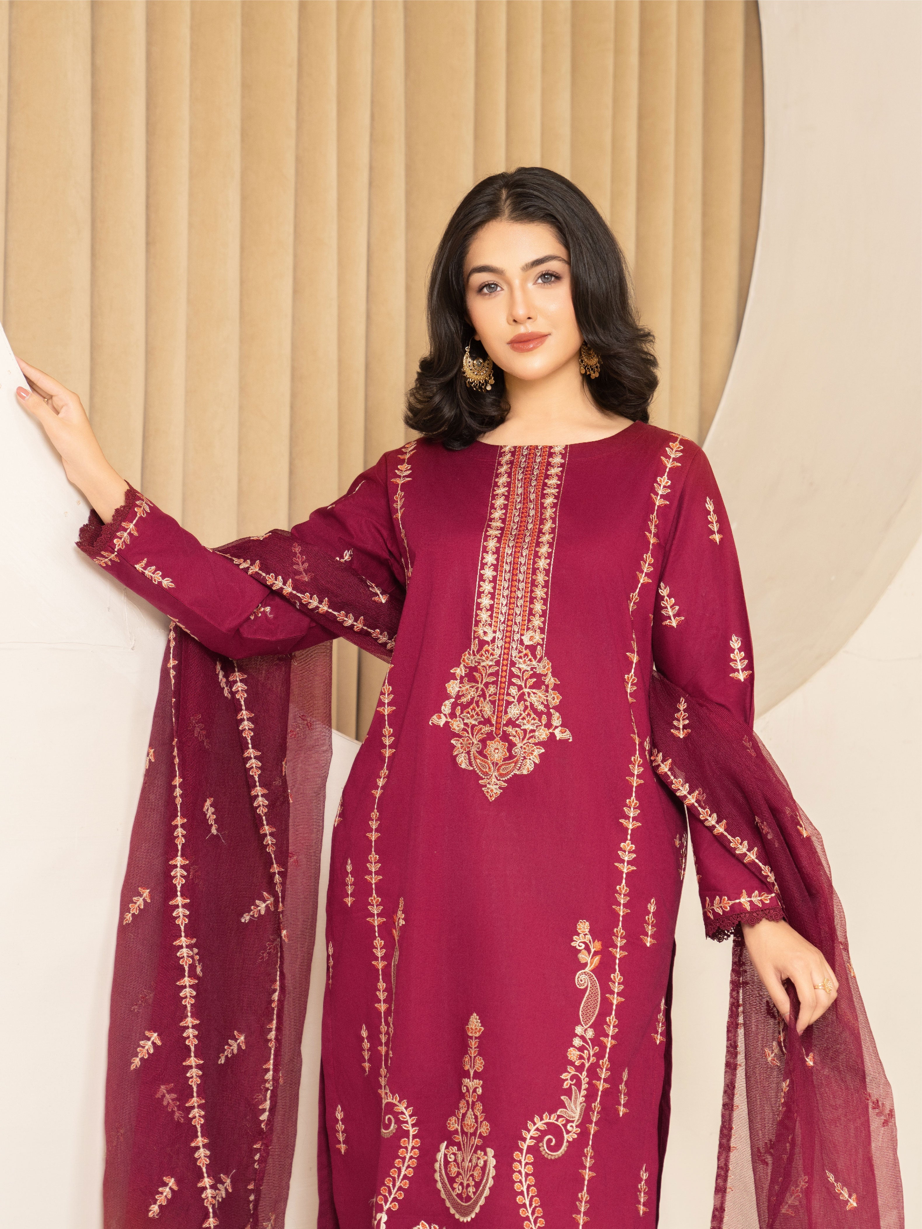 Turn heads with our captivating deep maroon ensemble. Featuring intricate embroidery on the neckline, front and sleeves, this outfit exudes timeless charm. The look is elevated with a gracefully embroidered cotton net dupatta, perfect for any festive or formal occasion.