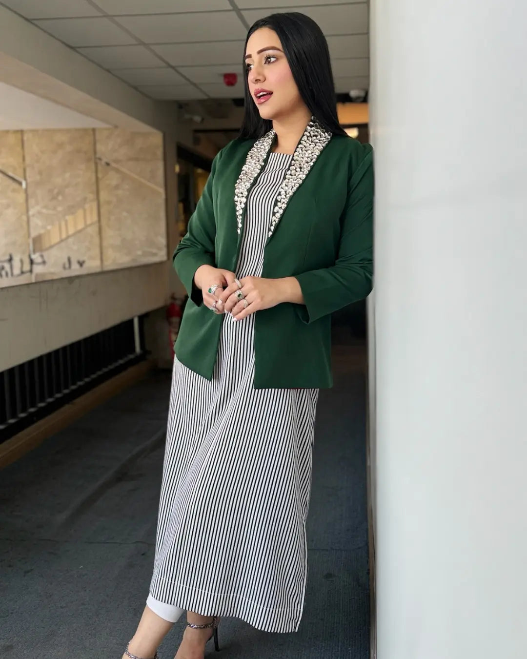 This stylish outfit features a jorjat shirt paired with a beautifully designed coat adorned with delicate stonework. Its elegant detailing makes it perfect for special occasions.