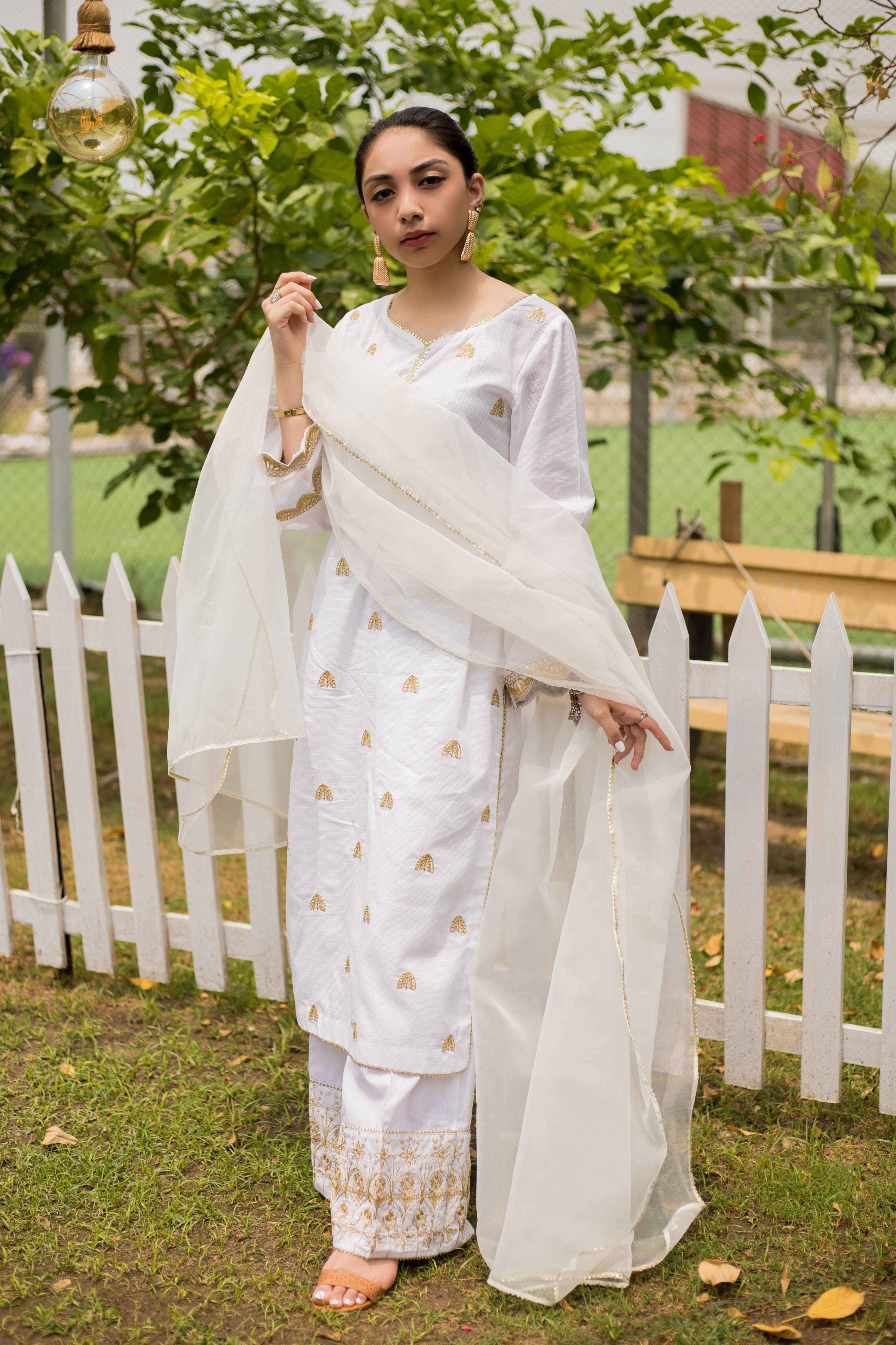 Long shirt with palazzo trousers and organza dupatta shirt is self cotton embellished with embroidery and sequins, stitched in a stylized way, finished with lace. Palazzo trousers are plain cotton embellished with embroidery and sequins, stitched in a stylized way, finished with lace. Dupatta is organza finished with lace.