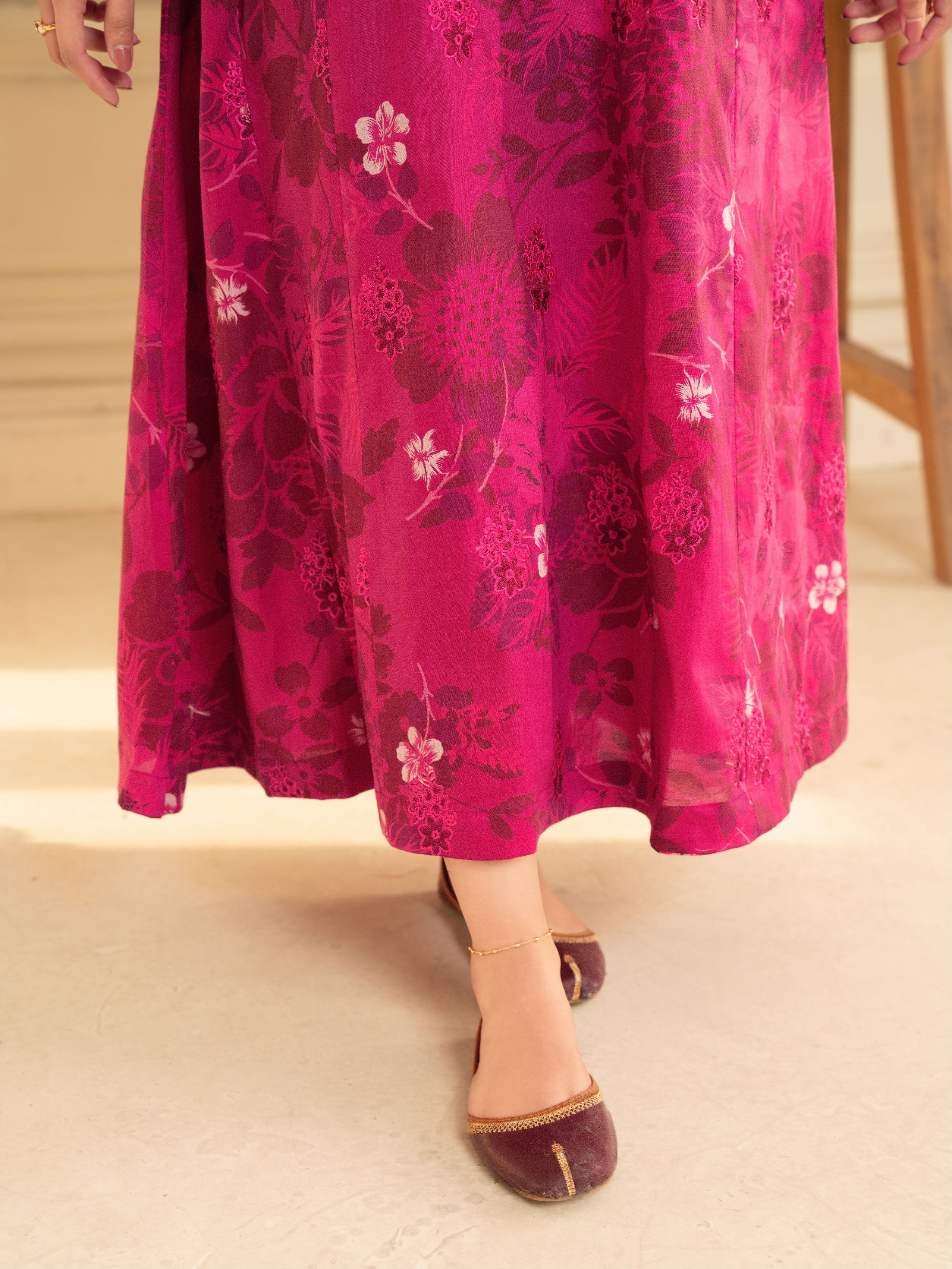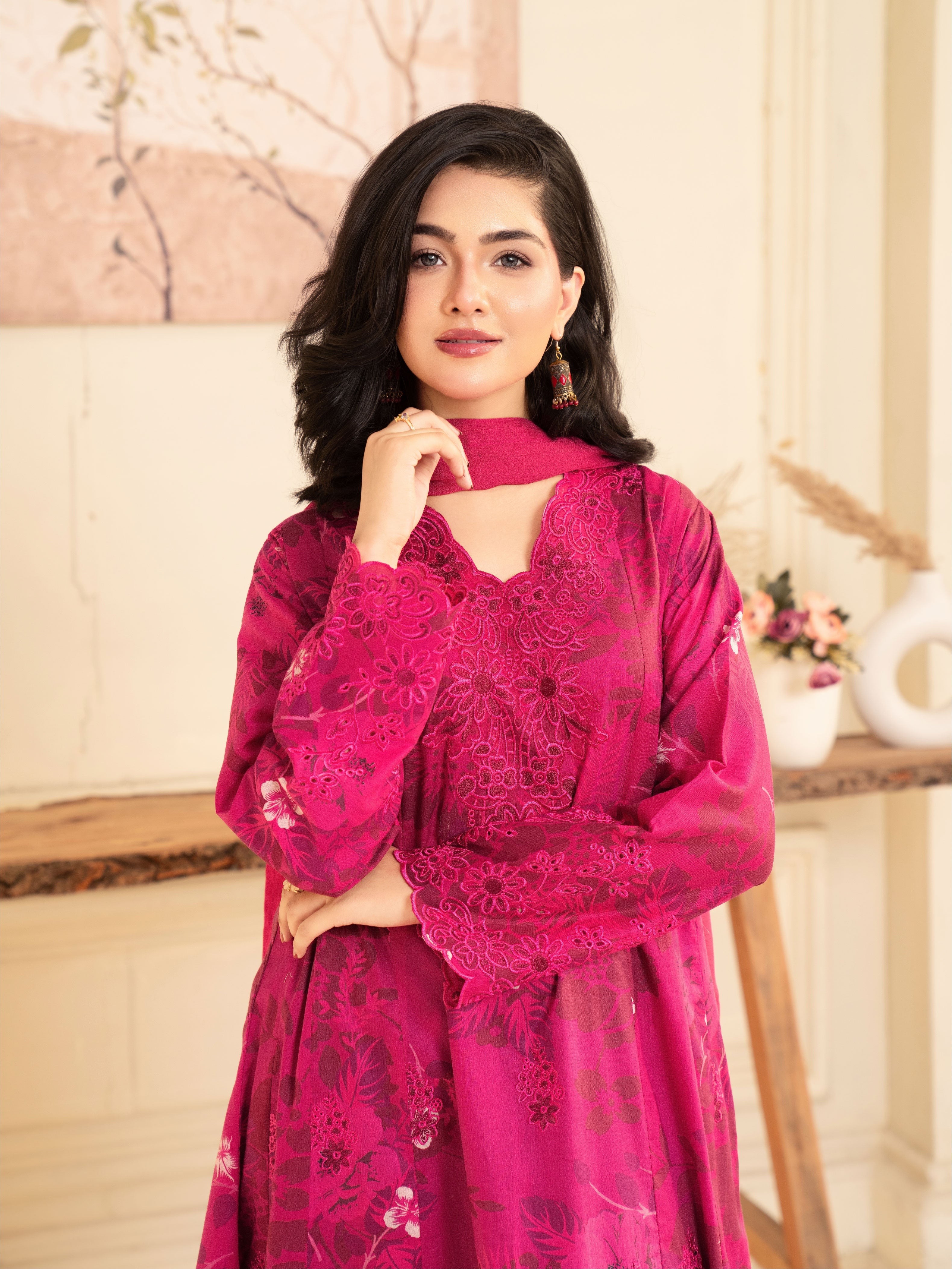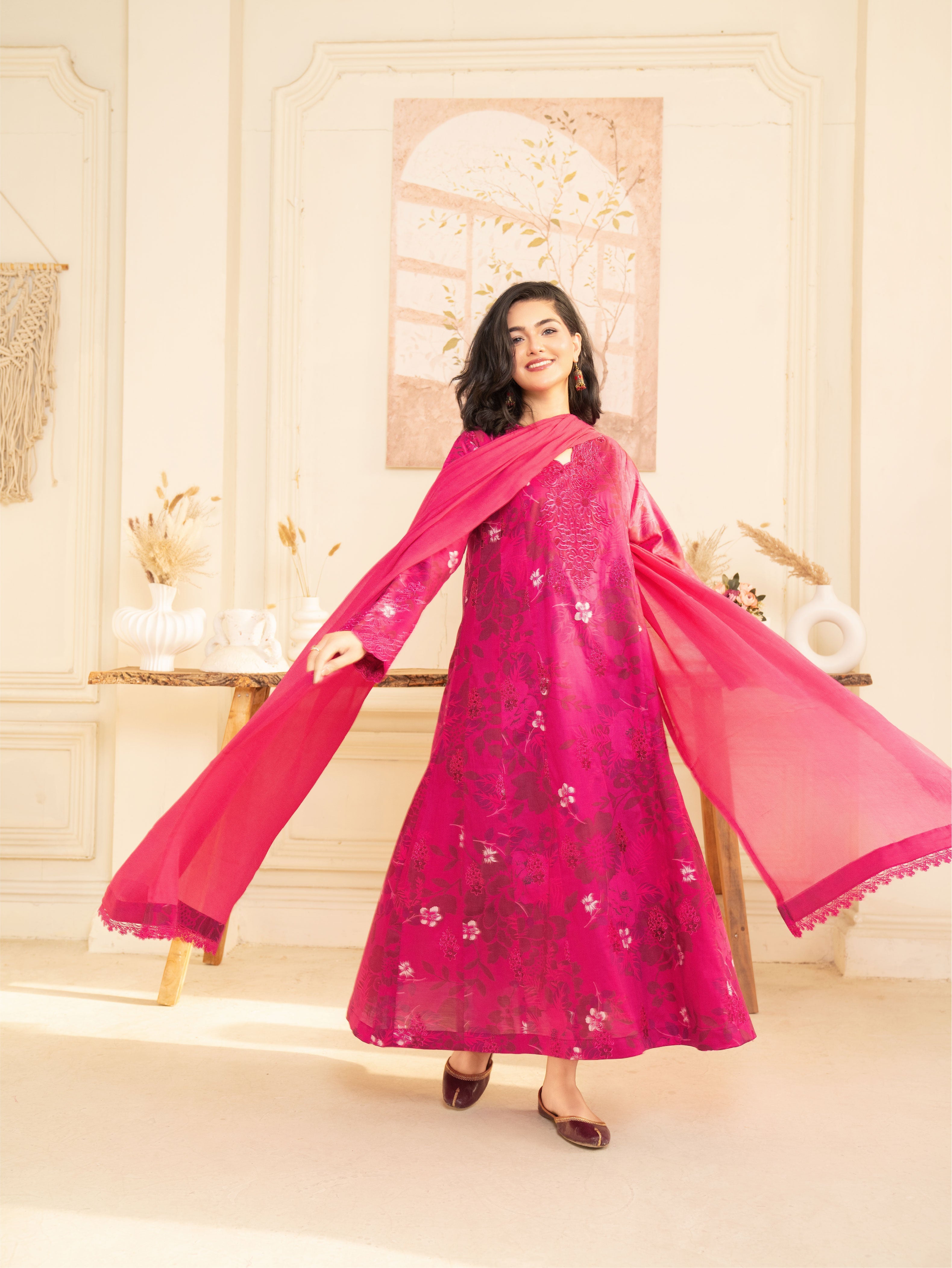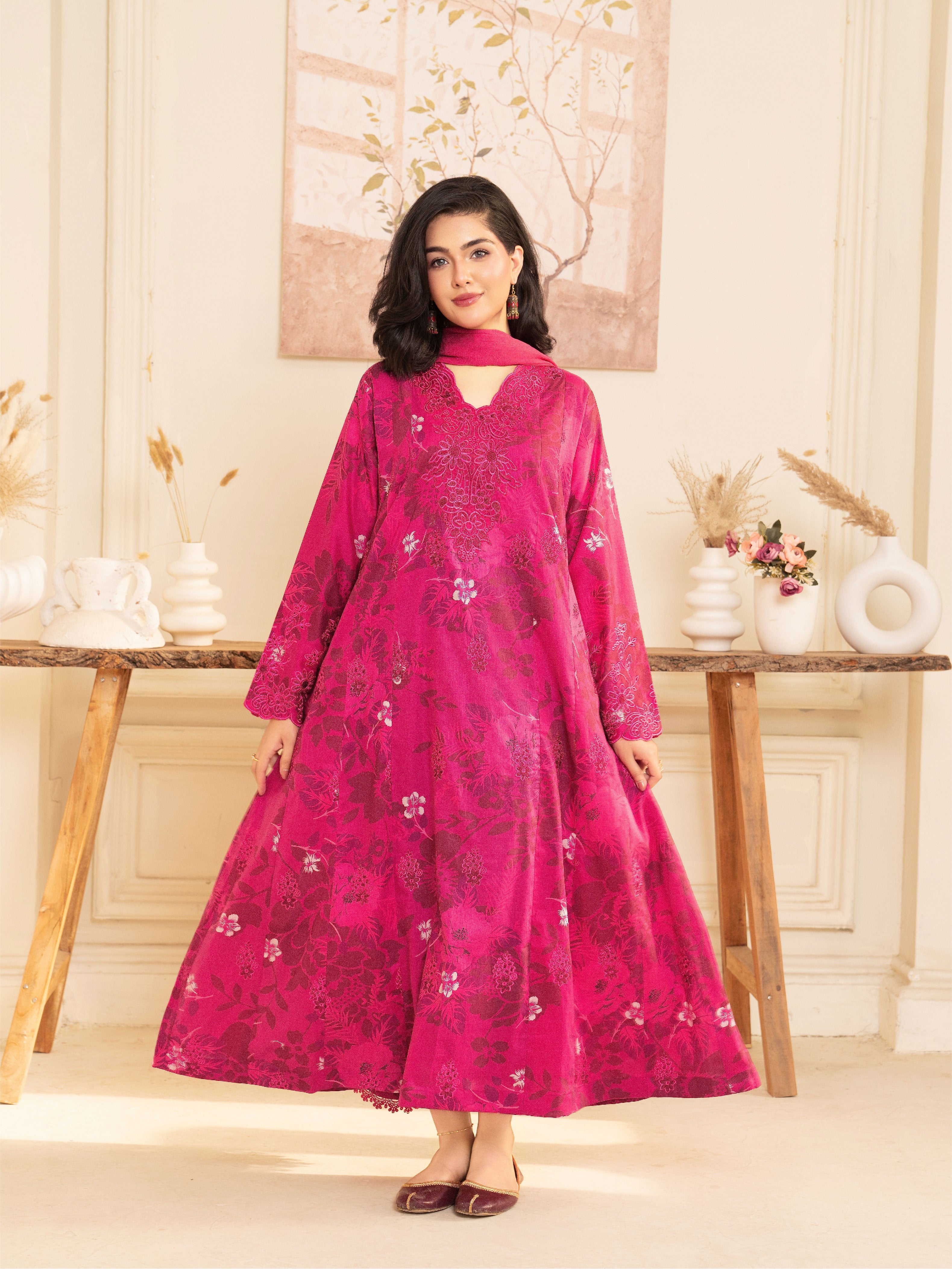 Experience elegance with our premium printed (shocking pink) Khirad ensemble. This article features a long embroidered frock with a chiffon dupata having lace embellishment.