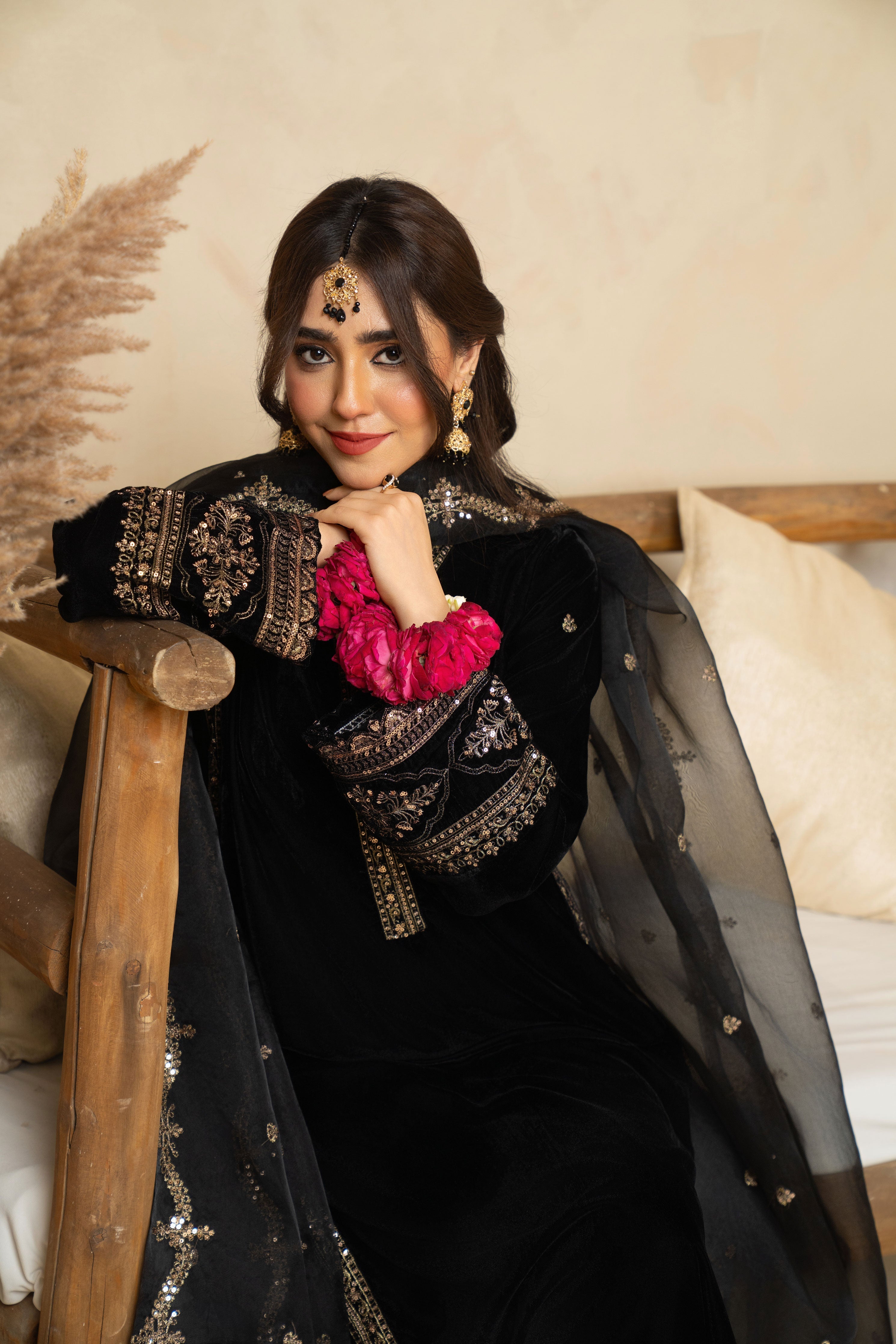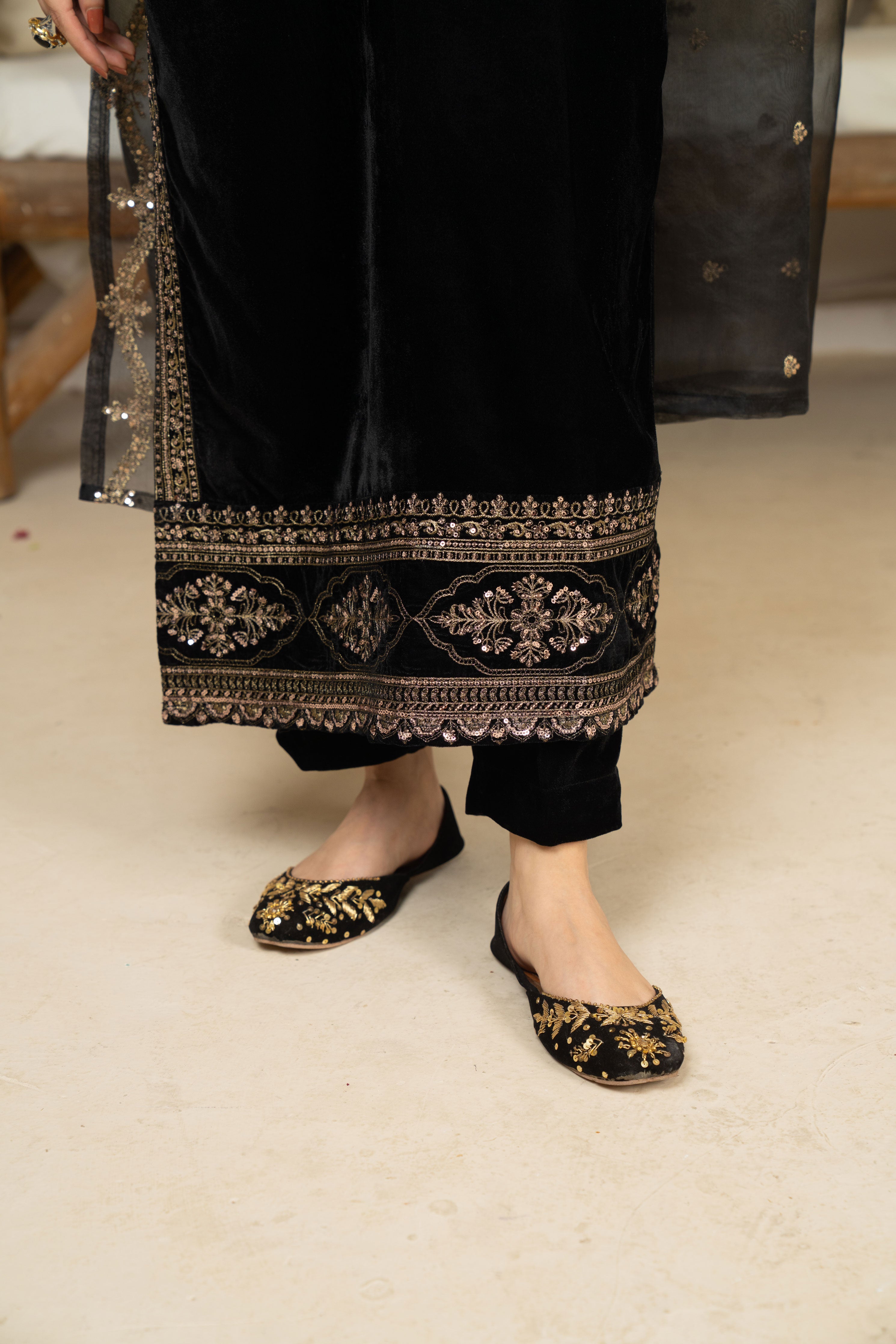 Step into timeless sophistication with our Festive Elegance in Black. Crafted on luxurious velvet, this stunning black ensemble features a long embroidered shirt adorned with intricate detailing. Paired with matching embroidered trousers and a beautifully embroidered organza dupatta, this outfit embodies regal charm and festive allure.