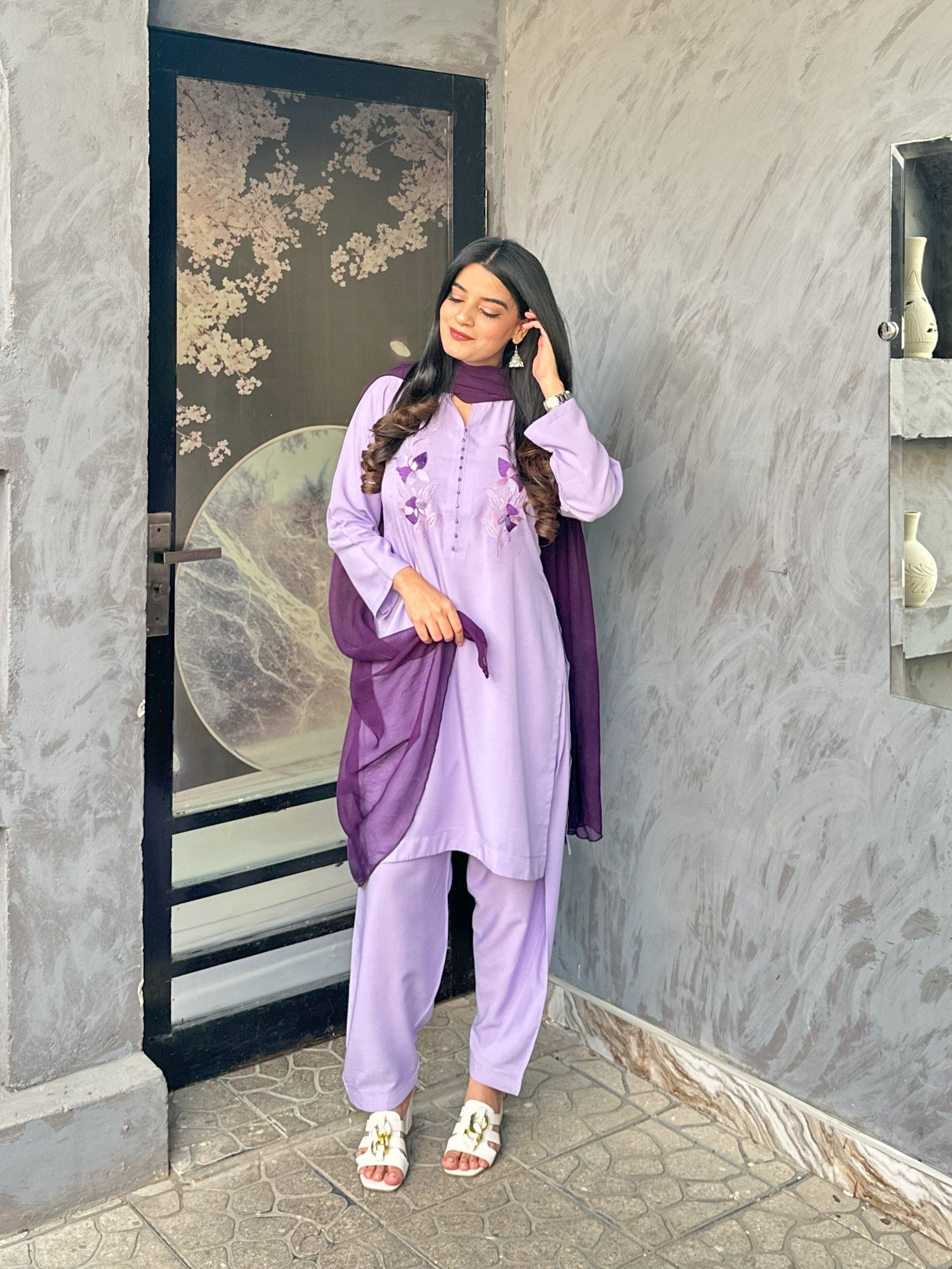 This co-ord set is designed with high-quality linen fabric and intricate handcrafted anchor embroidery on the shirt. The neckline is banded for a comfortable fit and it comes with a shalwar and chiffon dupatta for a complete look. Perfect for adding a touch of elegance to any occasion.