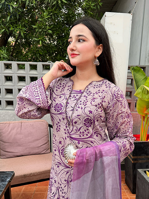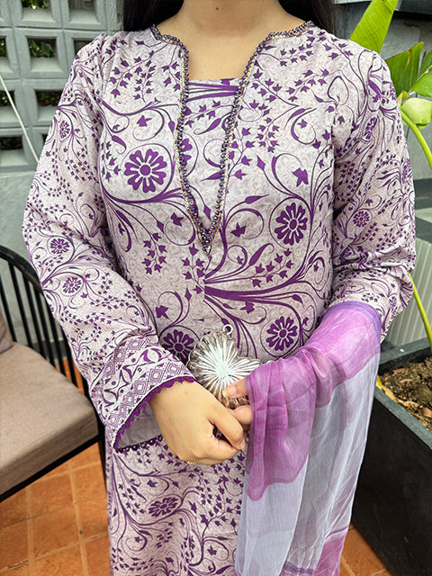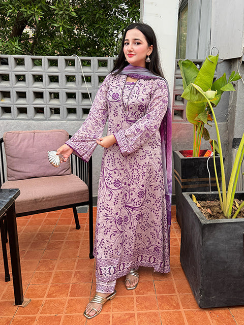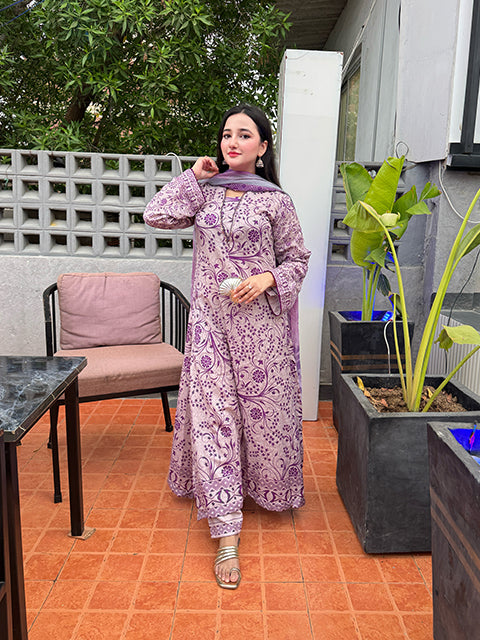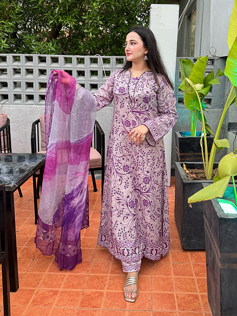 The intricate purple floral patterns and the soft lavender tones of the fabric give it a graceful, timeless charm perfect for party daily wear or semi-formal occasions.