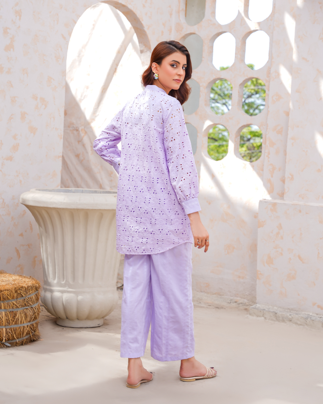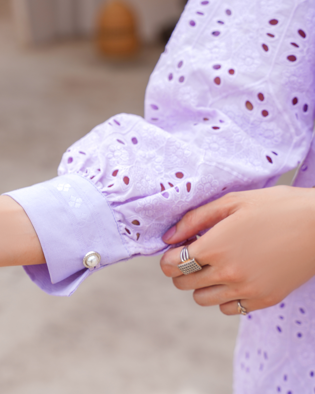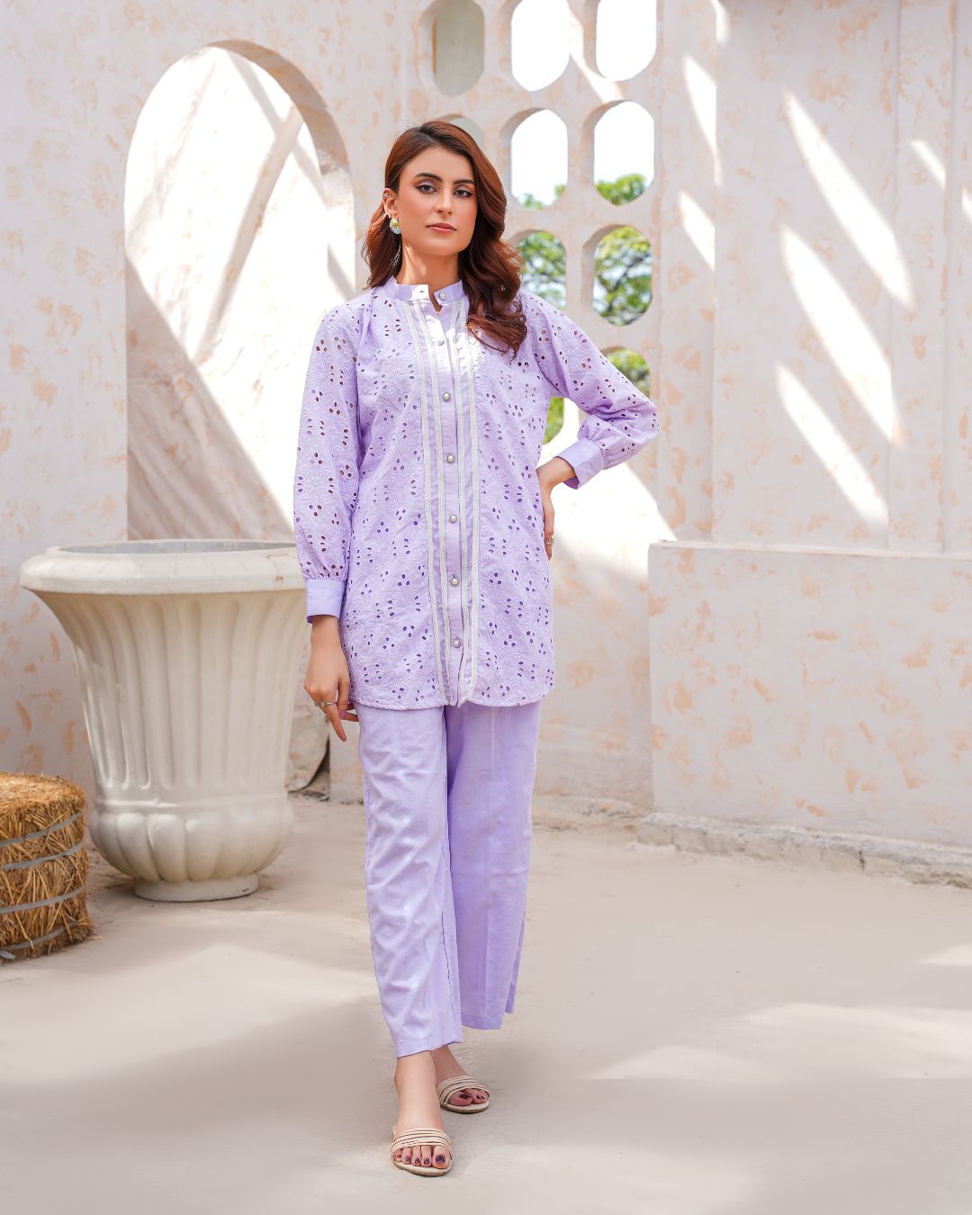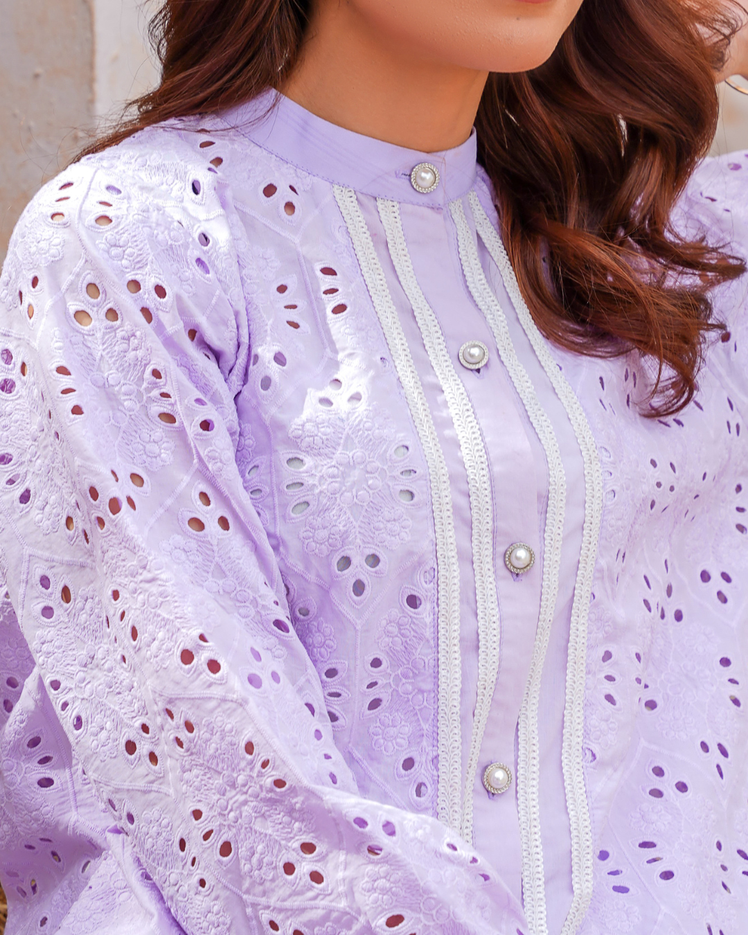 Contemporary Lawn button down top with chikan embroidery all over the shirt and lace finishing on the placket and Pearl Button. The hem features round edging while the sleeves have a flouncy cuff.